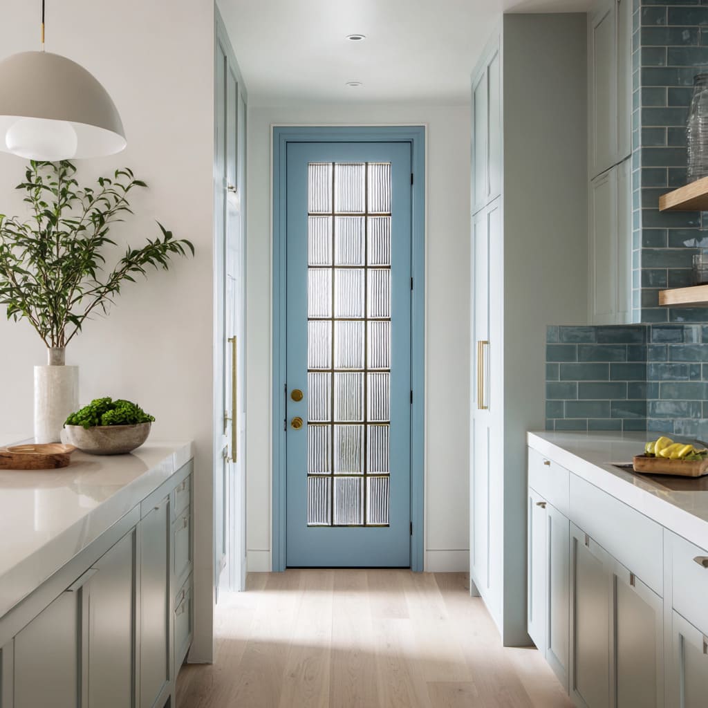 A refined kitchen half glass door design often uses color temperature as its true connector. Muted blues, soft greens, pale greys, and warm woods can sit together without visual confusion when the door quietly “coordinates” temperatures: a cool painted leaf can feel calm and architectural when warmed by wood shelving, warm-toned flooring, or brass-like linework in a grid; a dark-framed door can feel welcoming when the glass reads as an internal glow rather than a black block.
