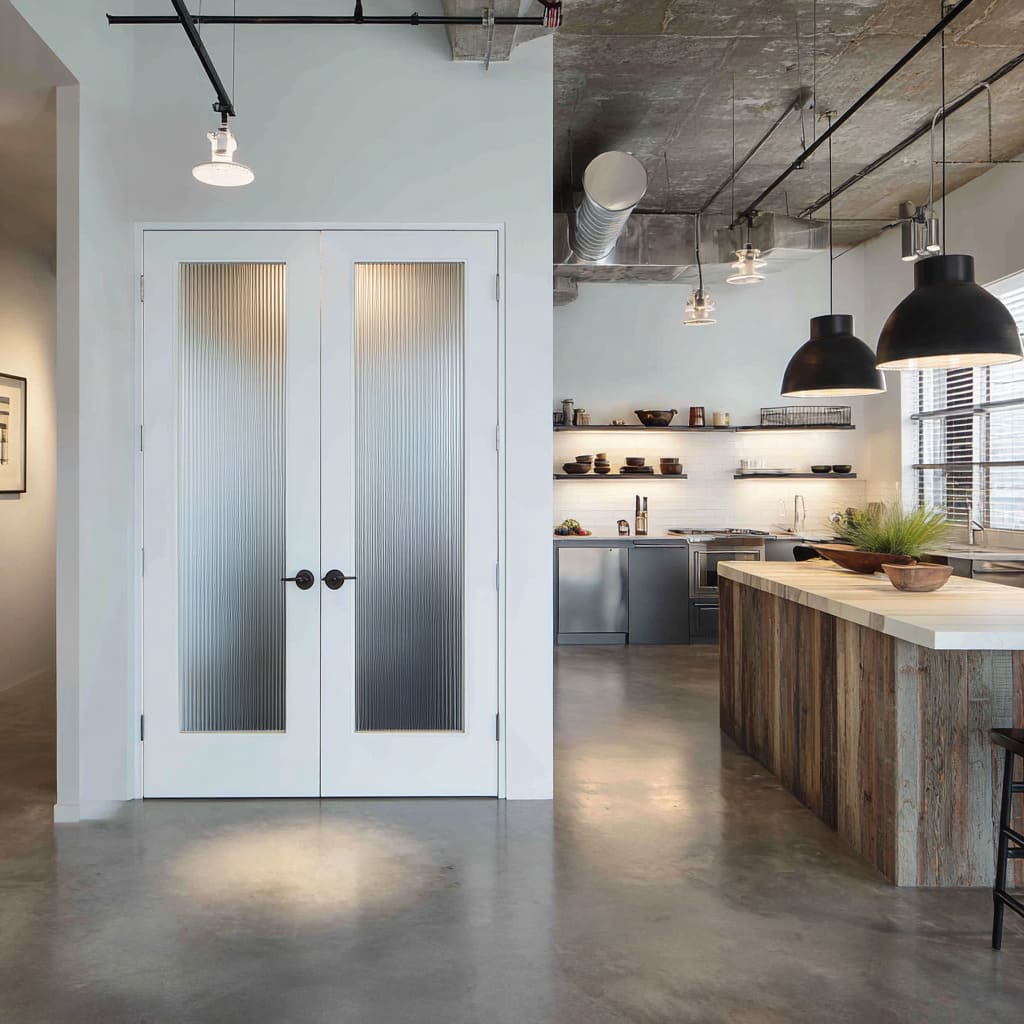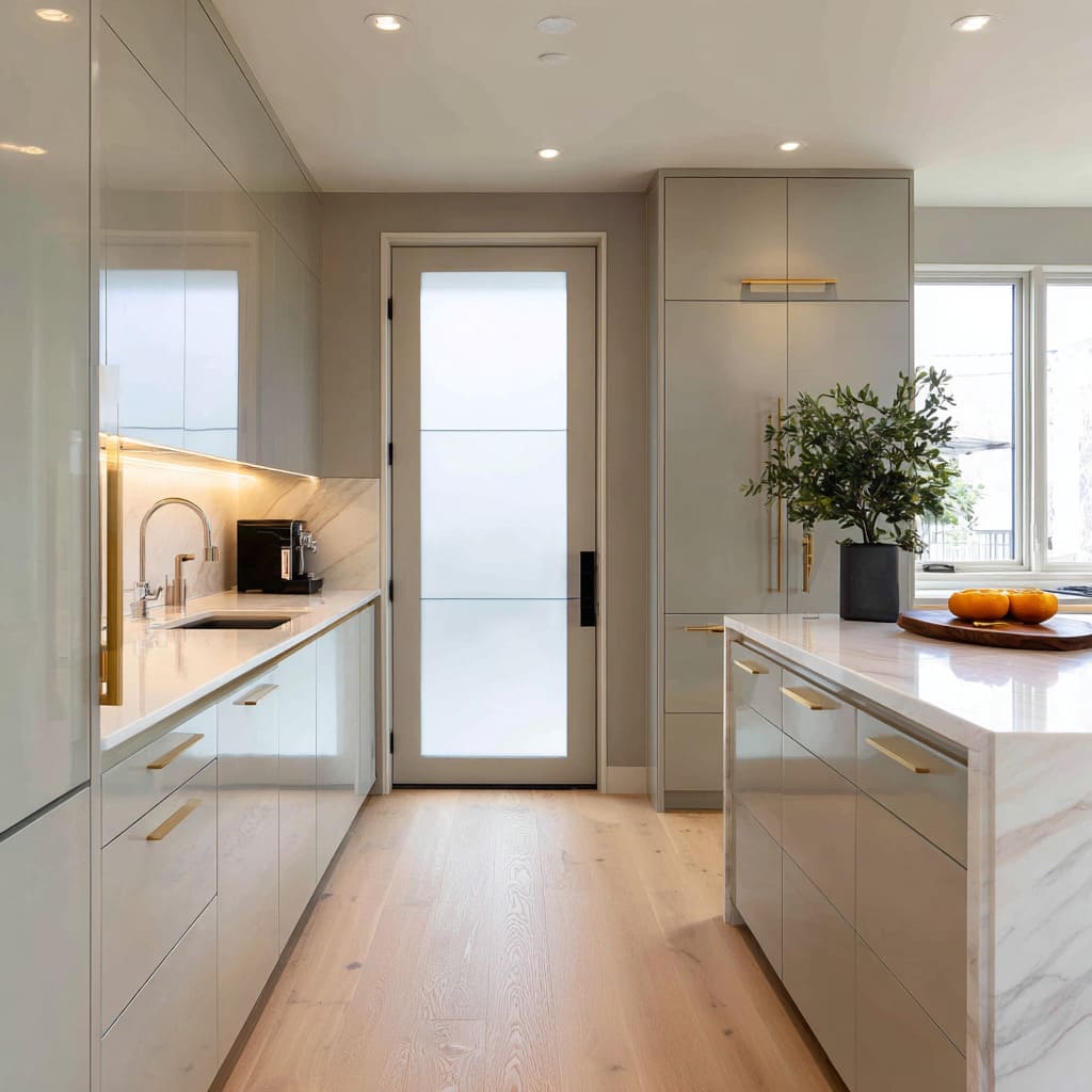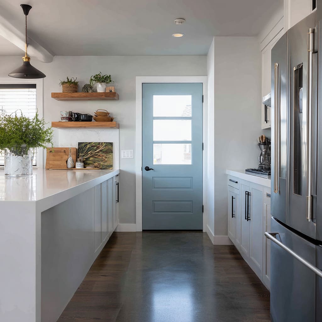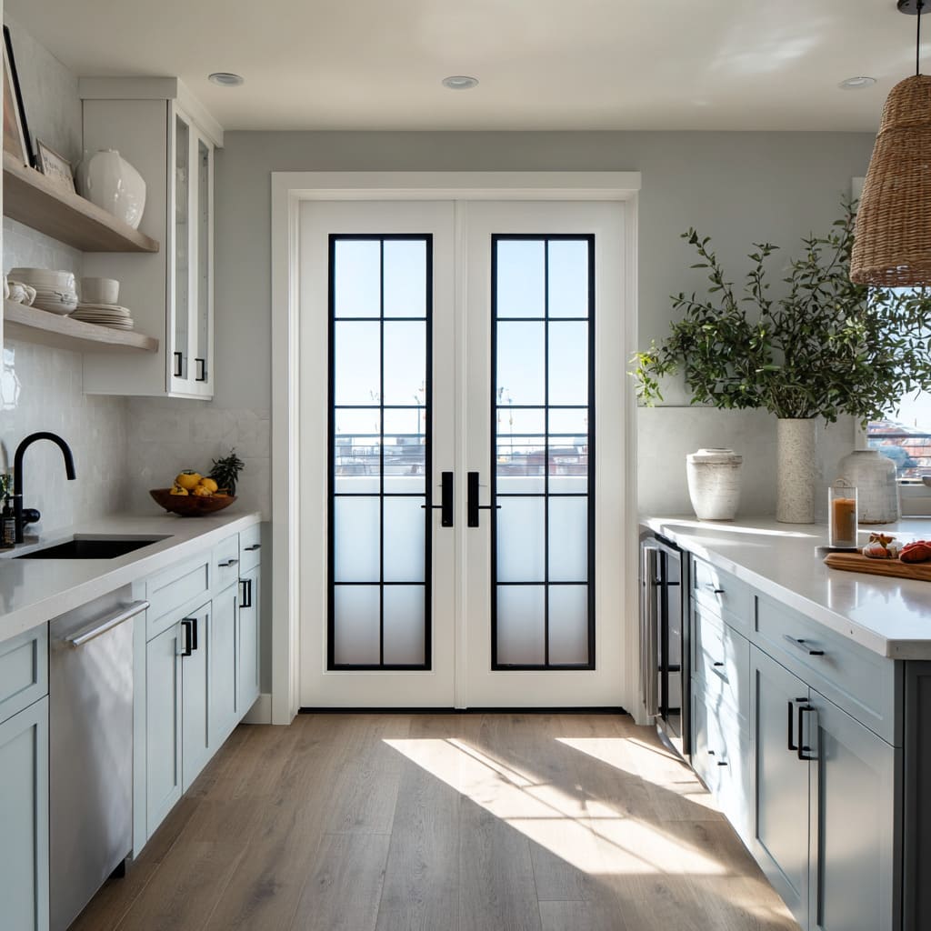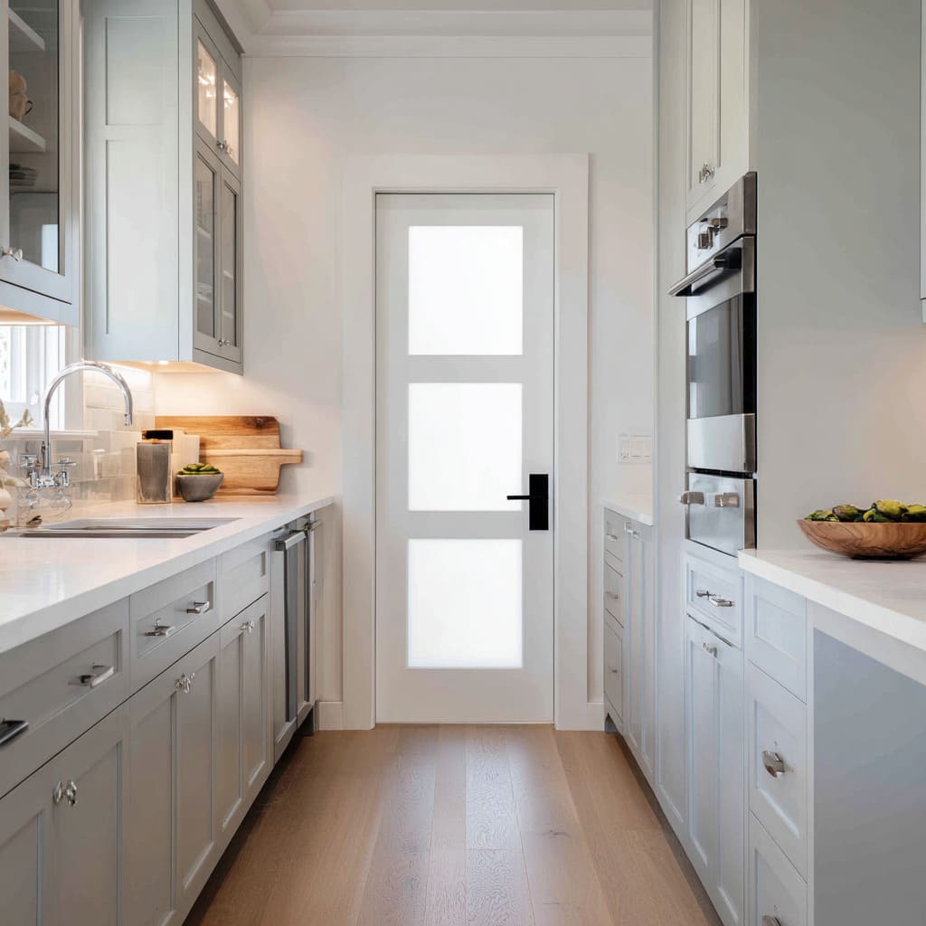 The core move is not transparency; it is luminance control—how bright the door reads relative to countertops, floors, cabinetry, and nearby daylight sources. A door that reads as the brightest vertical element can feel like an intentional end point, while a door that shares brightness with adjacent pale planes can feel absorbed into the room’s background language.