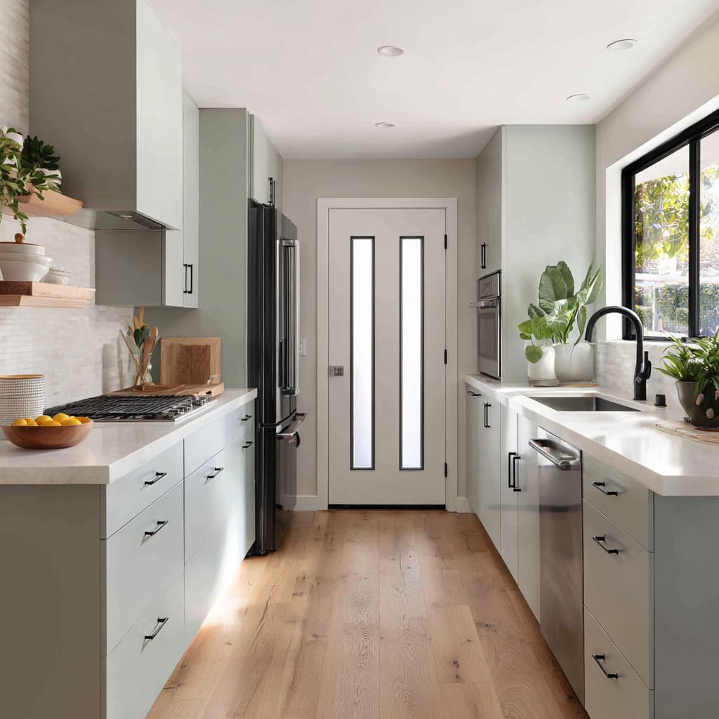 Many kitchen glass-door compositions gain their power from placement rather than decoration: when the door sits on axis at the end of a galley or hallway, it acts like a visual period that completes a long sentence of cabinetry runs and countertop rails. The room’s directional elements—floorboard direction, long counter edges, repeated ceiling downlights—often behave like guides that naturally carry attention forward, and the door becomes the resolution point where motion stops.