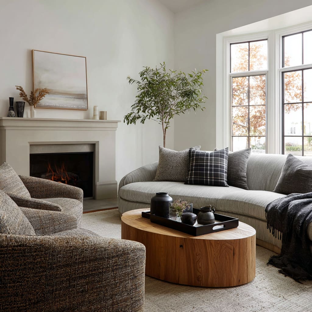 - Warmth at center height: wood tables and trays warm the middle of the composition so the seating doesn’t feel like a cool island.