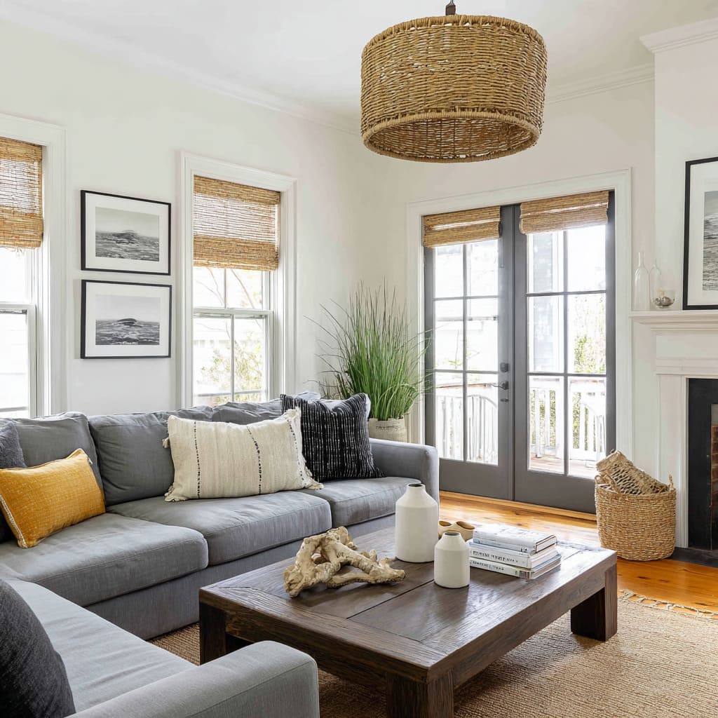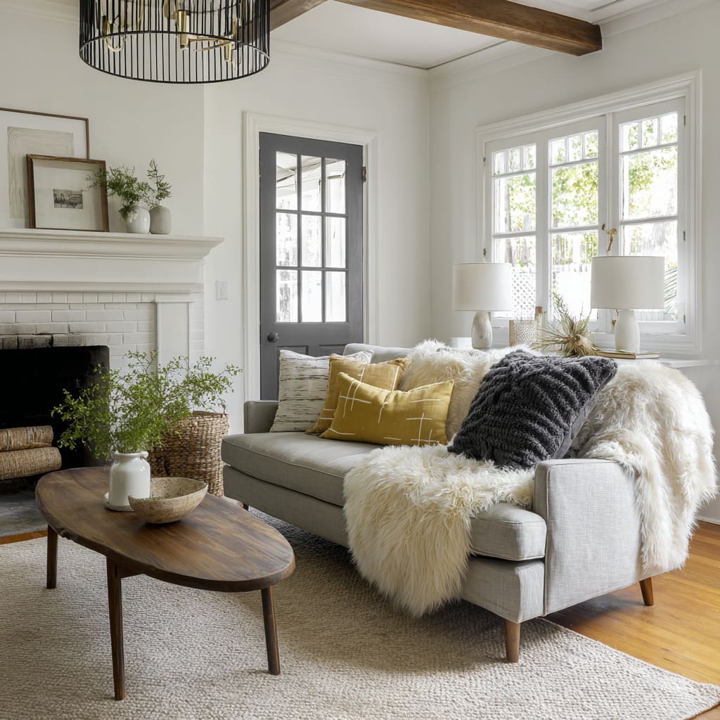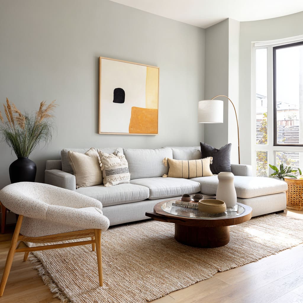 - Warm neutral platform: natural fiber or warm greige rugs make the sofa feel grounded and cozy while keeping the interior design bright. This is the relaxed, sunny approach—grey looks softer because the ground plane warms it.