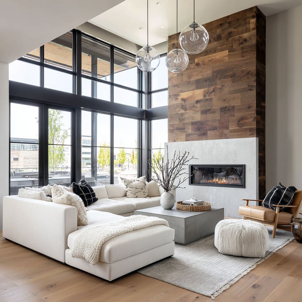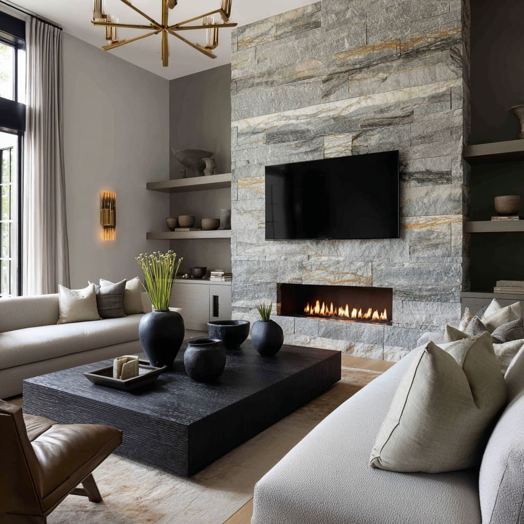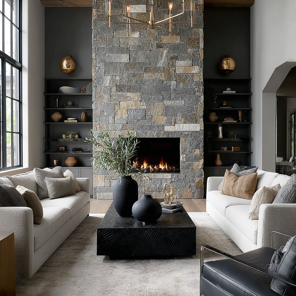 - If there is a stone fireplace, the ladder is unusually clear: pale sofas sit next to a big black center table (heavy but low), behind that sits a large stone surface with mixed values, and then small warm metal notes appear sparingly. That sequence makes the sofas feel like calm architecture framing a feature, not like “two couches.”