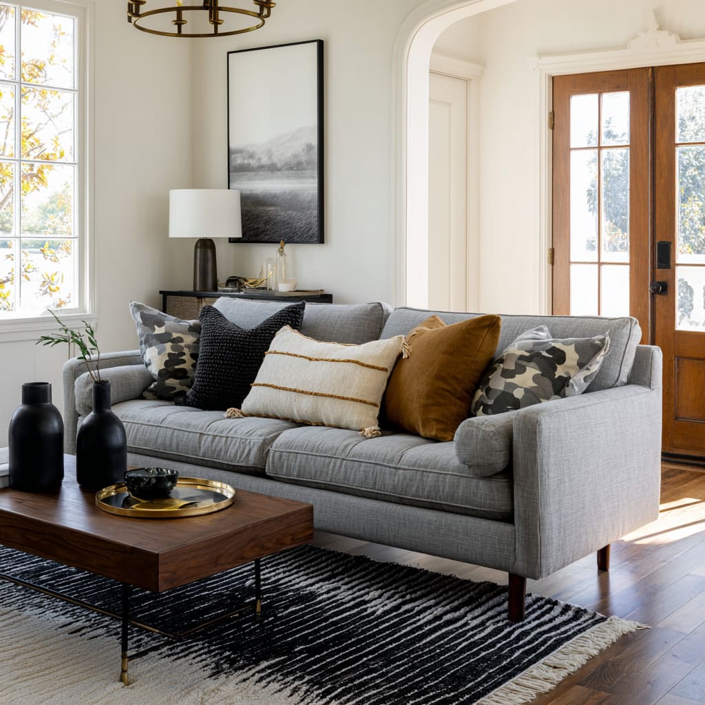 - End punctuation: darker or denser pillows often sit closer to the ends to sharpen the sofa silhouette, like visual bookends.