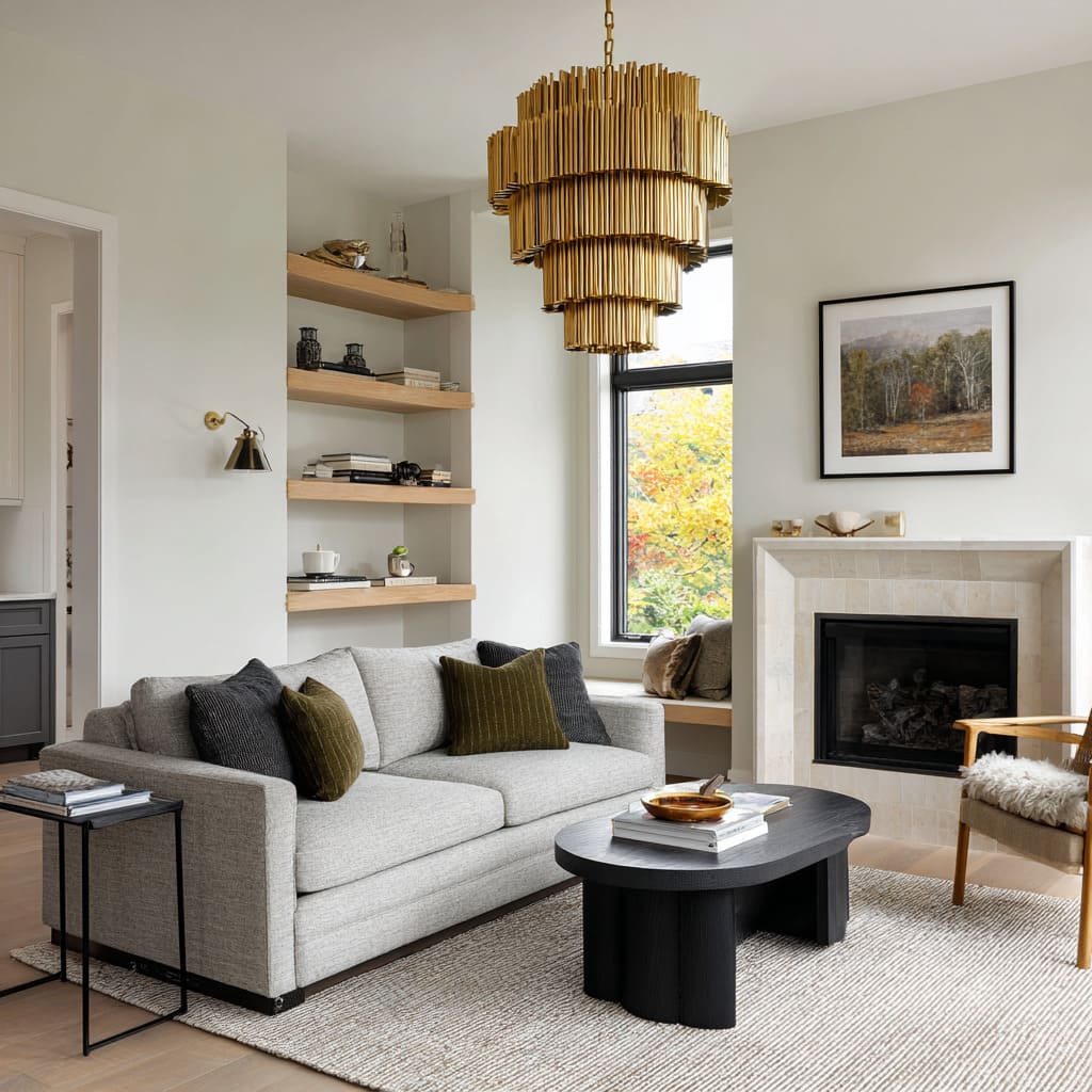 - Warmth at ceiling height: brass chandeliers, woven pendants, or warm-toned fixtures create a gentle golden bias that affects the whole seating zone.
