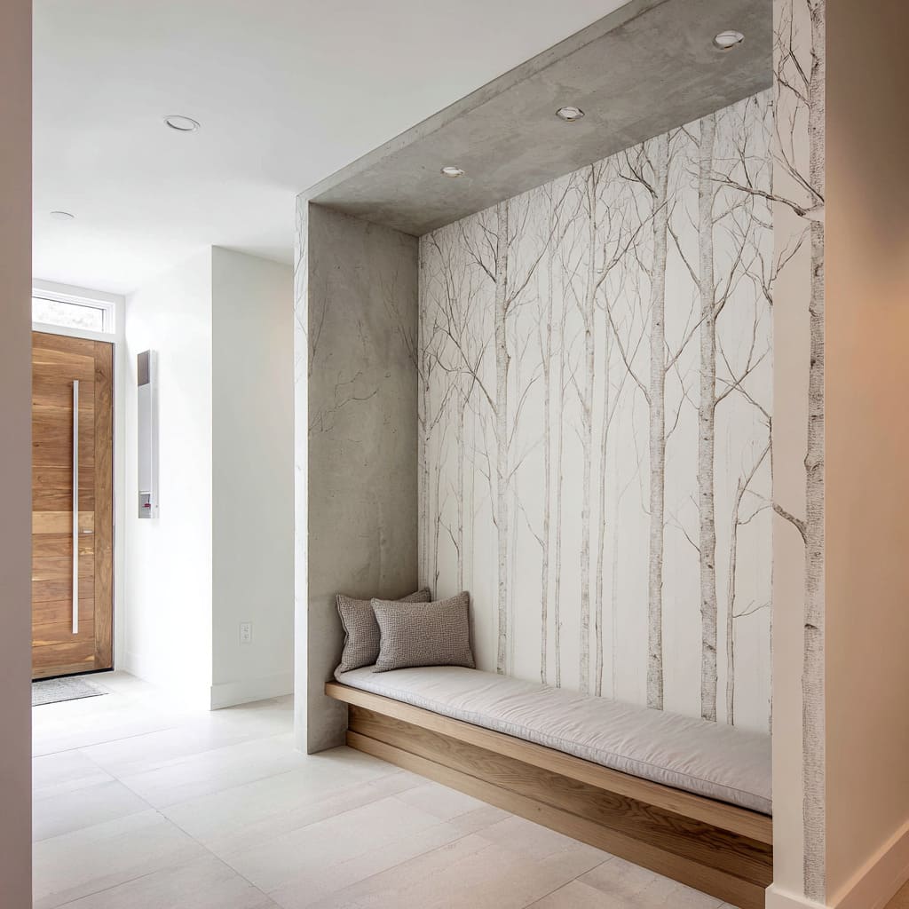 Entry niche design with birch mural inside a concrete frame built-in bench that feels like a calm alcove