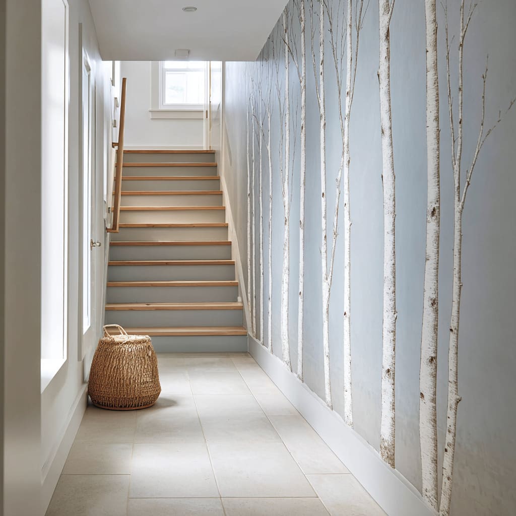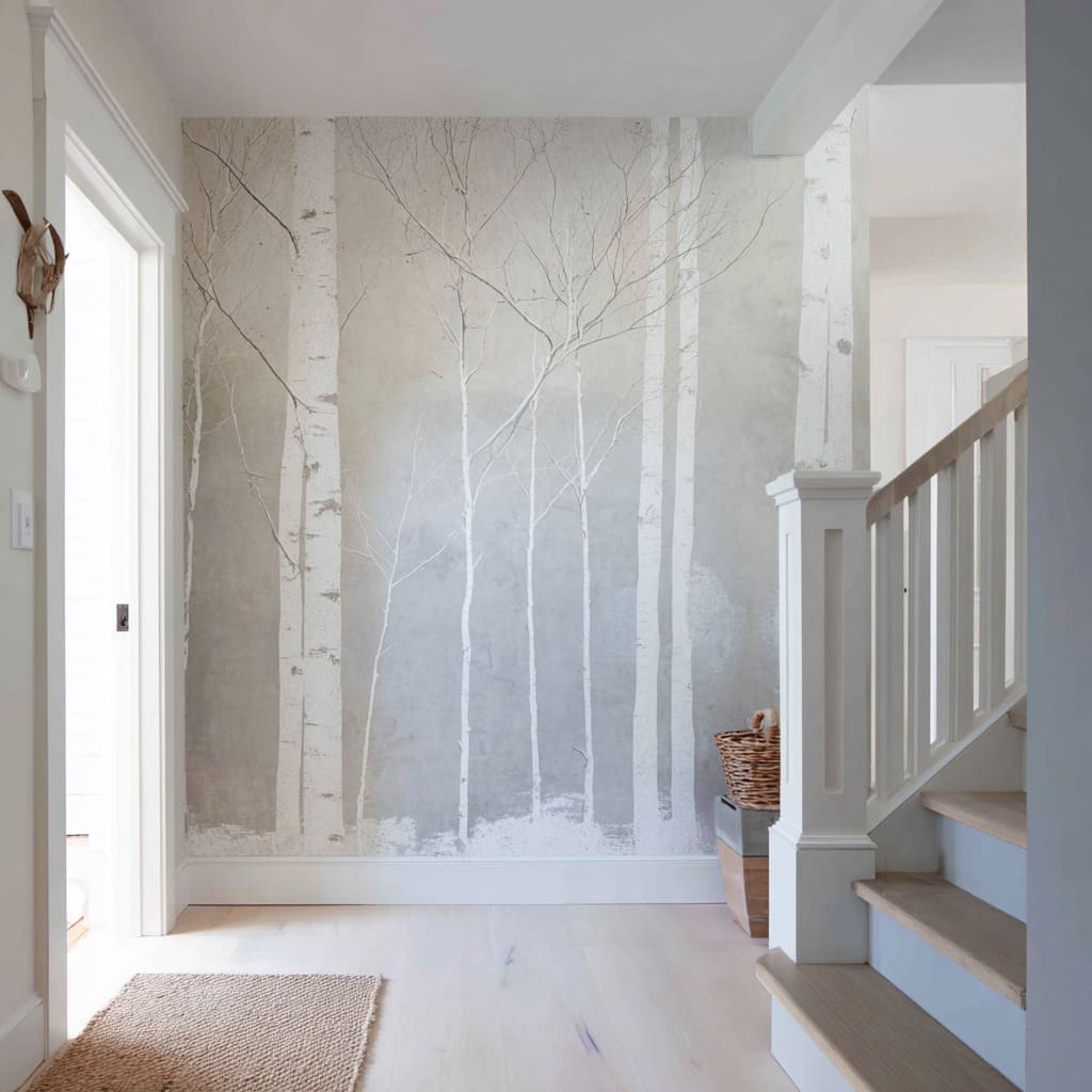 cottage-clean foyer concept with mist gradient birch mural and traditional stair trim that keeps it gentle, not edgy