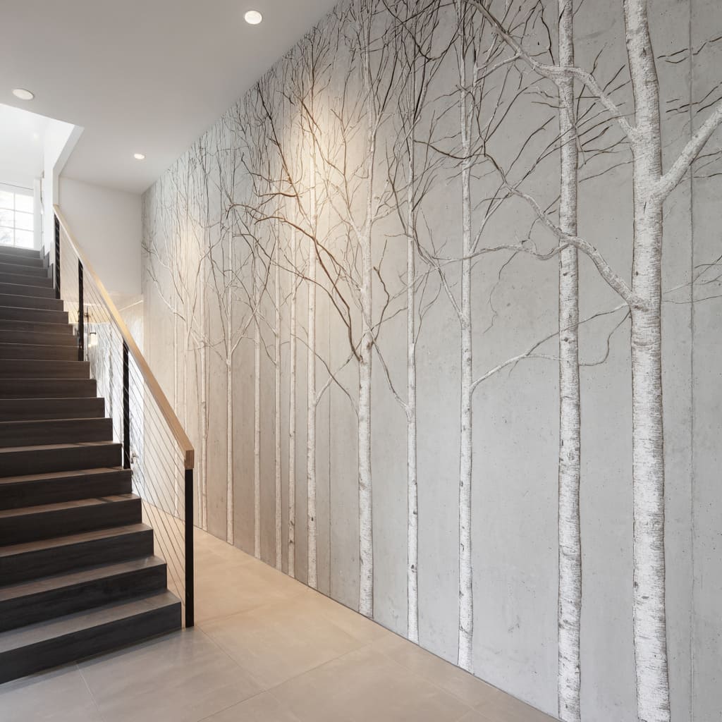 Modern stair corridor concept with extra-long birch wall mural and concrete-panel feel, a single warm light sun spot