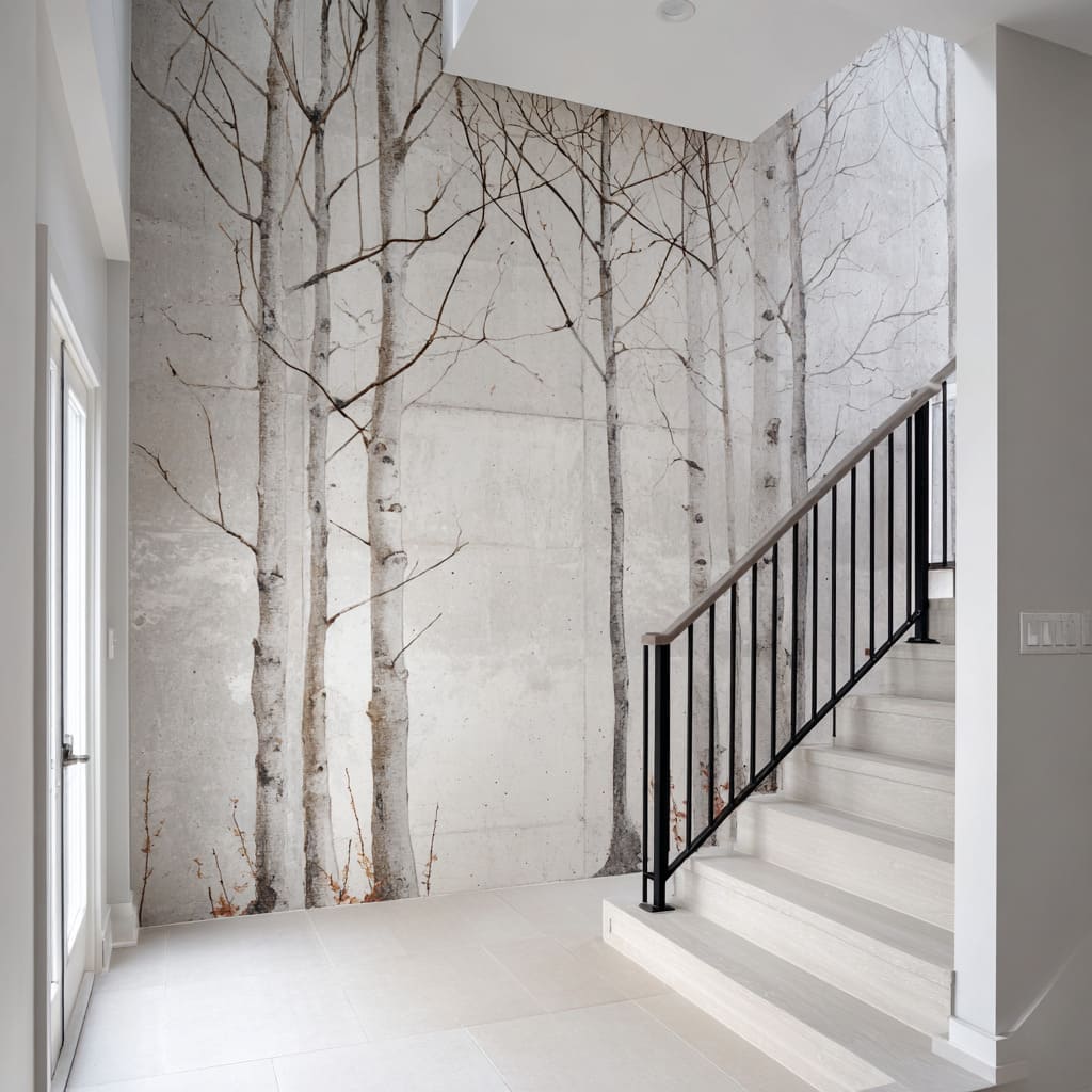 This is a common reason design minimal foyer schemes pair birch scenes with clean stair geometry: the design feels alive without adding objects.