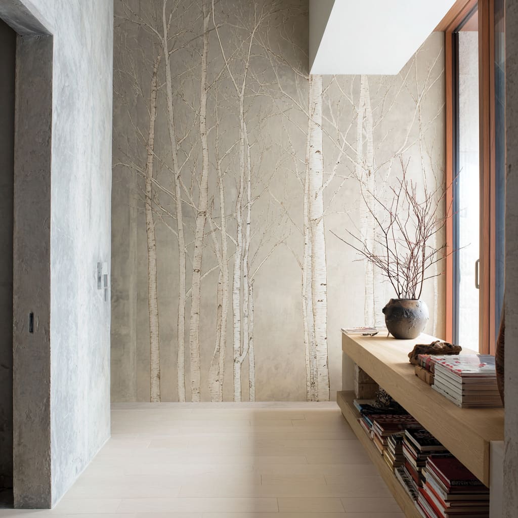 Here the birch tree mural sits inside a defined pocket—by contrast, by mass, or by an architectural surround—so the wall reads curated and deliberate, like a quiet gallery insert.