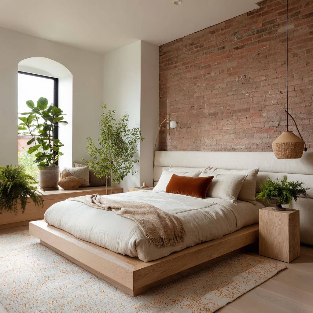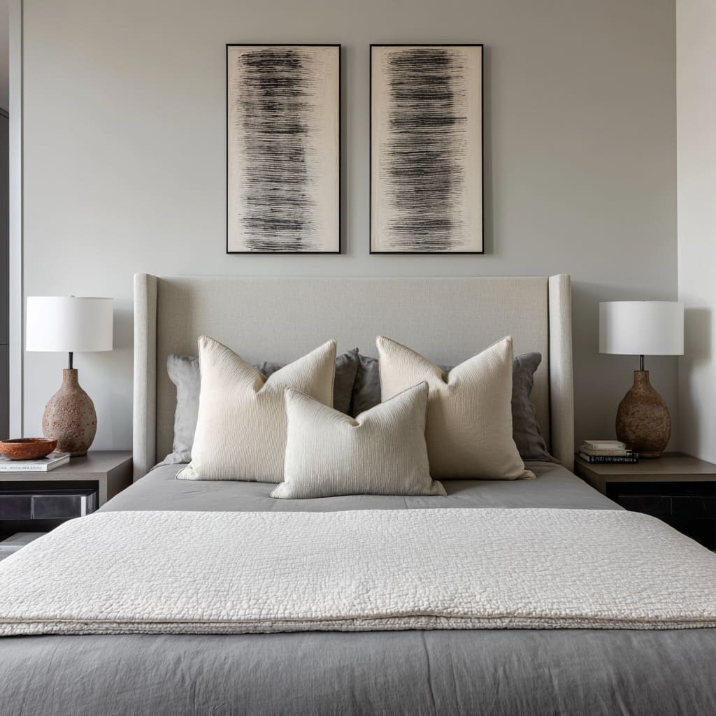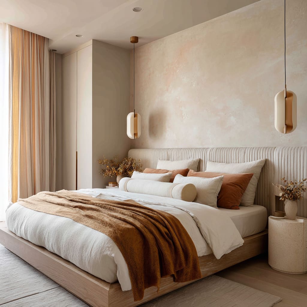 Rather than filling the room with bold touches, many compositions favor precise, quiet moments of contrast—a single charcoal lumbar pillow on a pale bed, a rust-hued throw folded loosely, or one dark ceramic lamp beside a soft white wall. These gestures aren’t meant to grab attention but to guide it.
