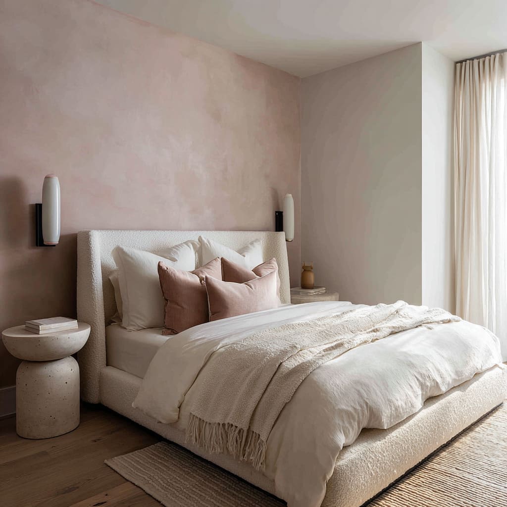 This subtle method keeps the room from breaking into isolated pieces. A boucle headboard in off-white picks up a trace of mauve when set against plum plaster, making the texture feel linked rather than floating.