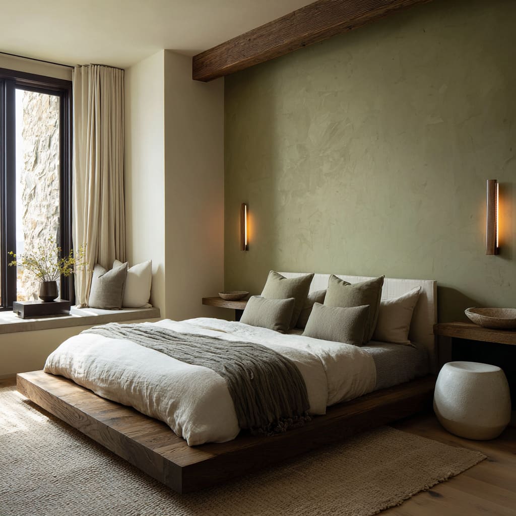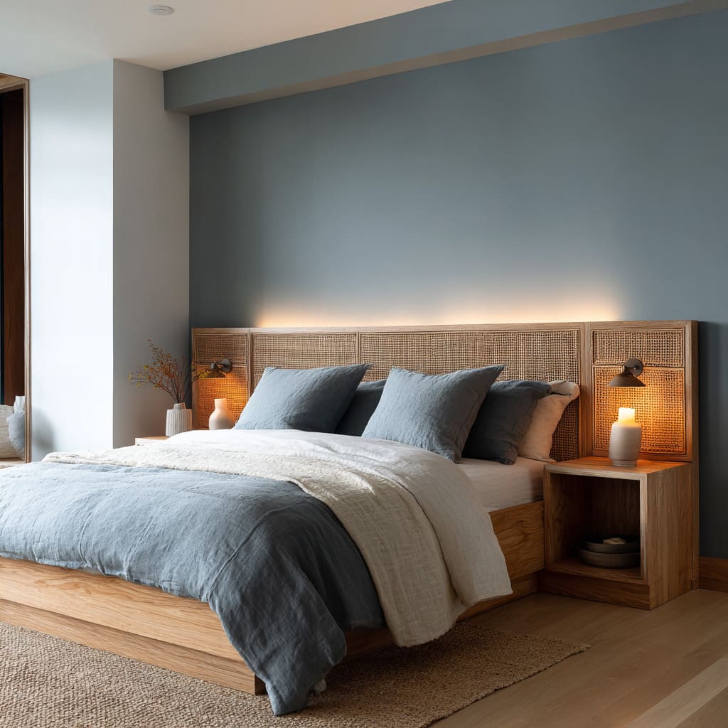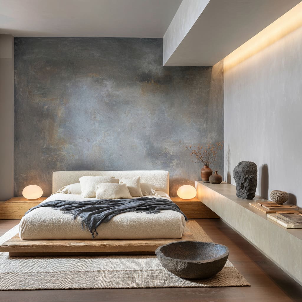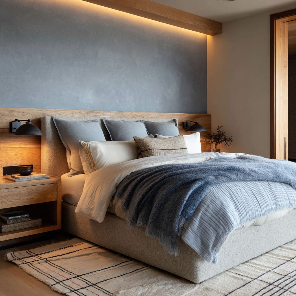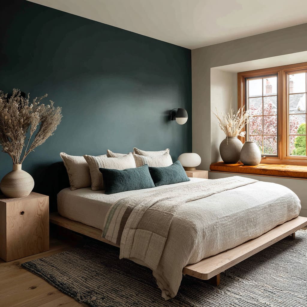 It’s a move that shifts power from color intensity to composition. A stormy teal wall behind a platform bed reads as firm but not loud when the bed stays low and the materials around it remain matte and soft.