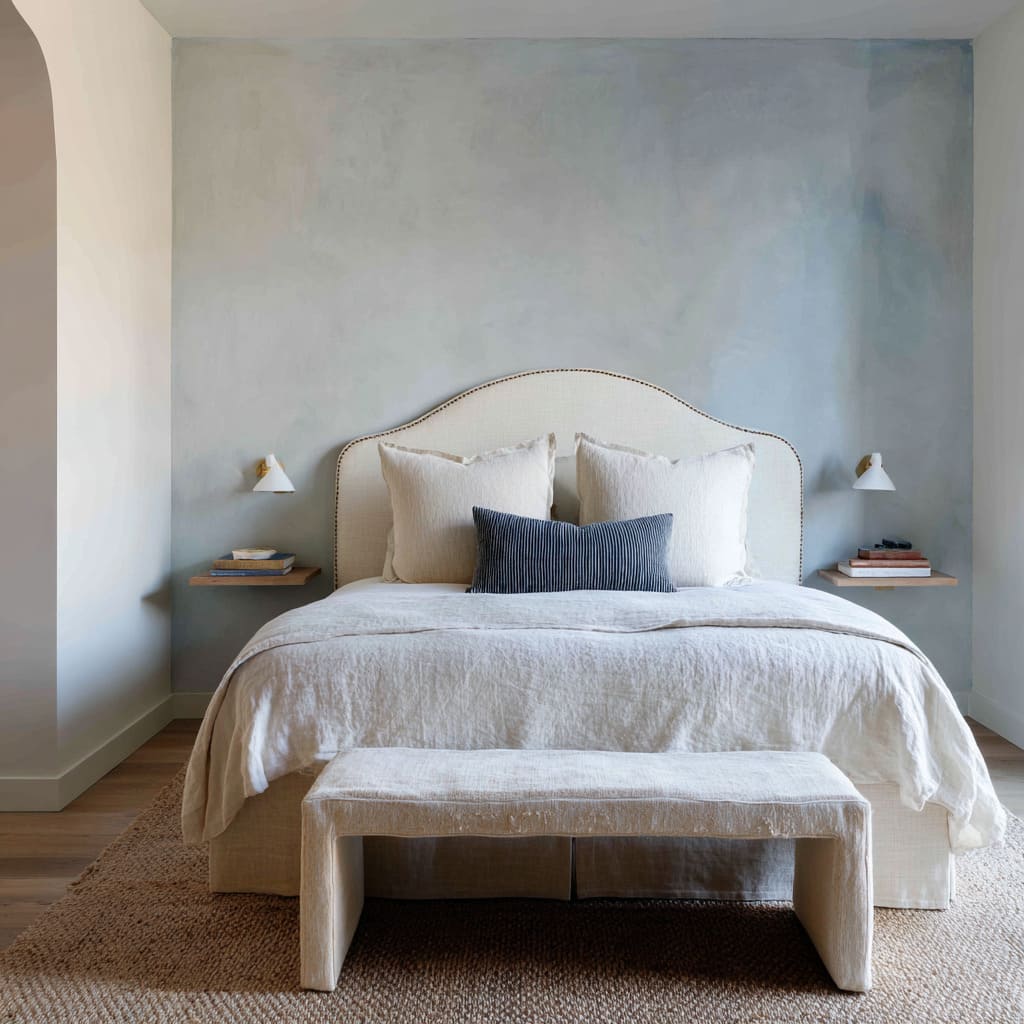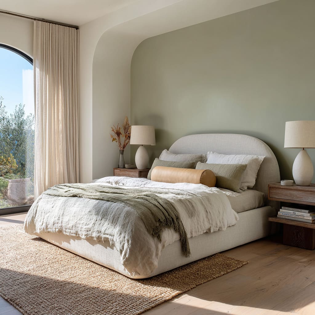 A curve-framed bed placed in front of a saturated wall—whether it’s deep teal, rich plum, or moody wine—feels integrated, not separate, because the geometry echoes the softness of the finish itself. Orb-style lamps and boucle-covered headboards don’t just add texture; they blur the transition point where vertical meets horizontal.