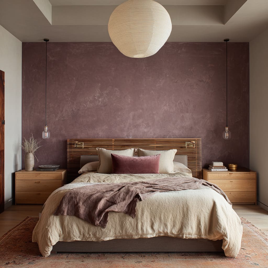 A plum plaster wall feels rich, not moody, when it’s paired with symmetrical furnishings and pale wood elements that carry warmth. The effect isn’t about contrast—it’s about restraint.