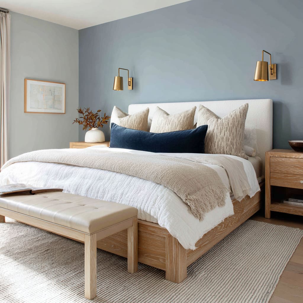 It stays clear as the main visual plane, while the small accents become the details that anchor the larger shapes and tones. This is especially useful in bedroom accent wall color ideas that lean toward nuance—misty blues, clay washes, silvery taupes.