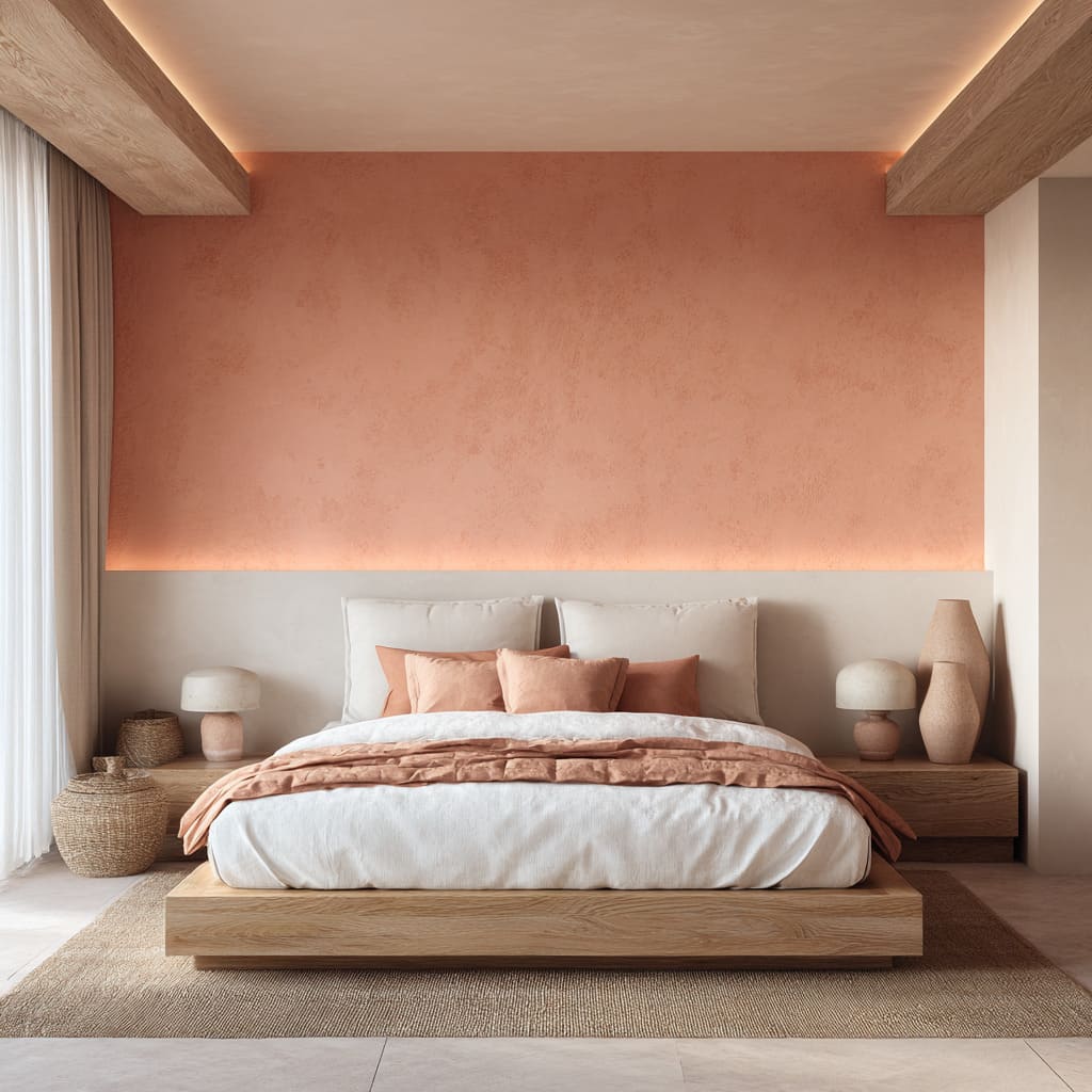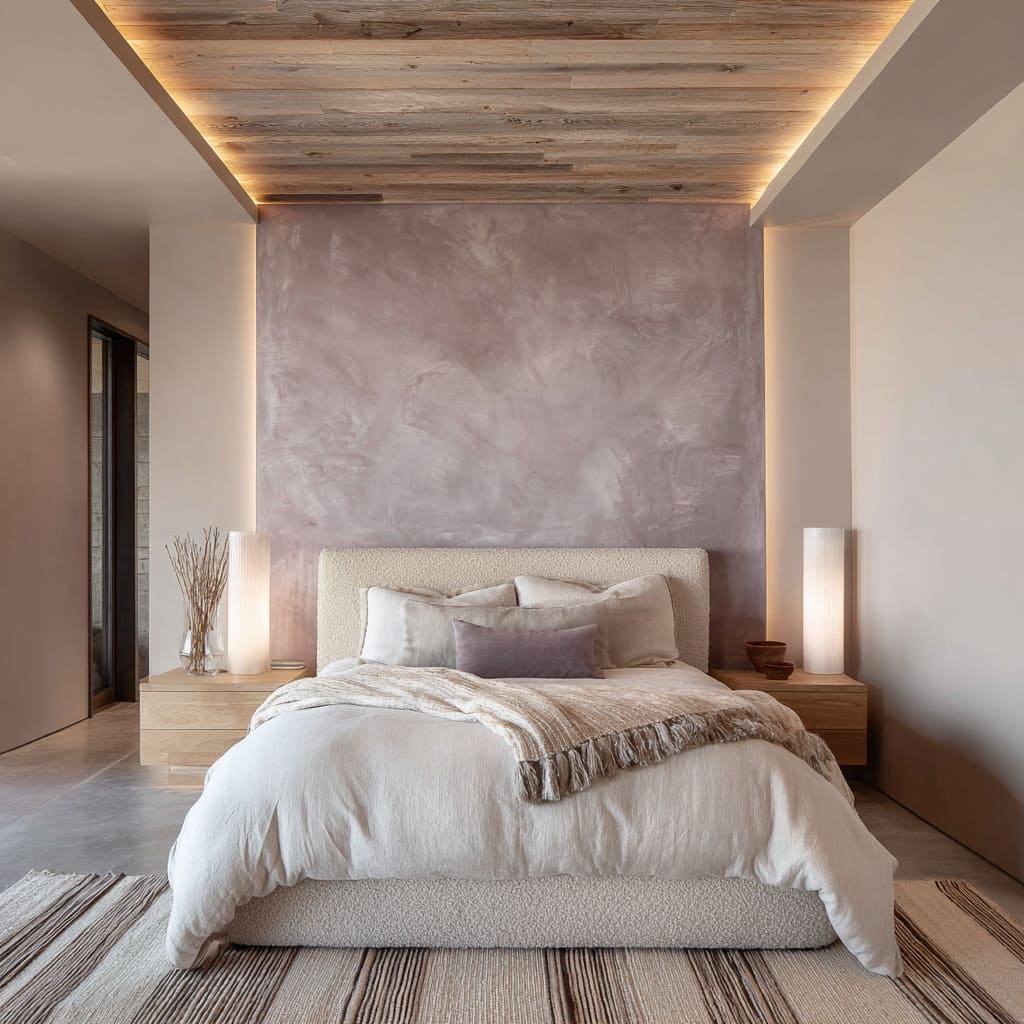 Cove lighting, tucked into a recess above a clay-toned wall, draws out its pink undercurrents, warming the entire surface without needing a direct beam. A concealed strip behind a headboard on a blue-grey wall turns the tone silver at night, adding a cool glow that redefines the wall’s role after dark.