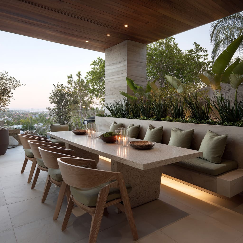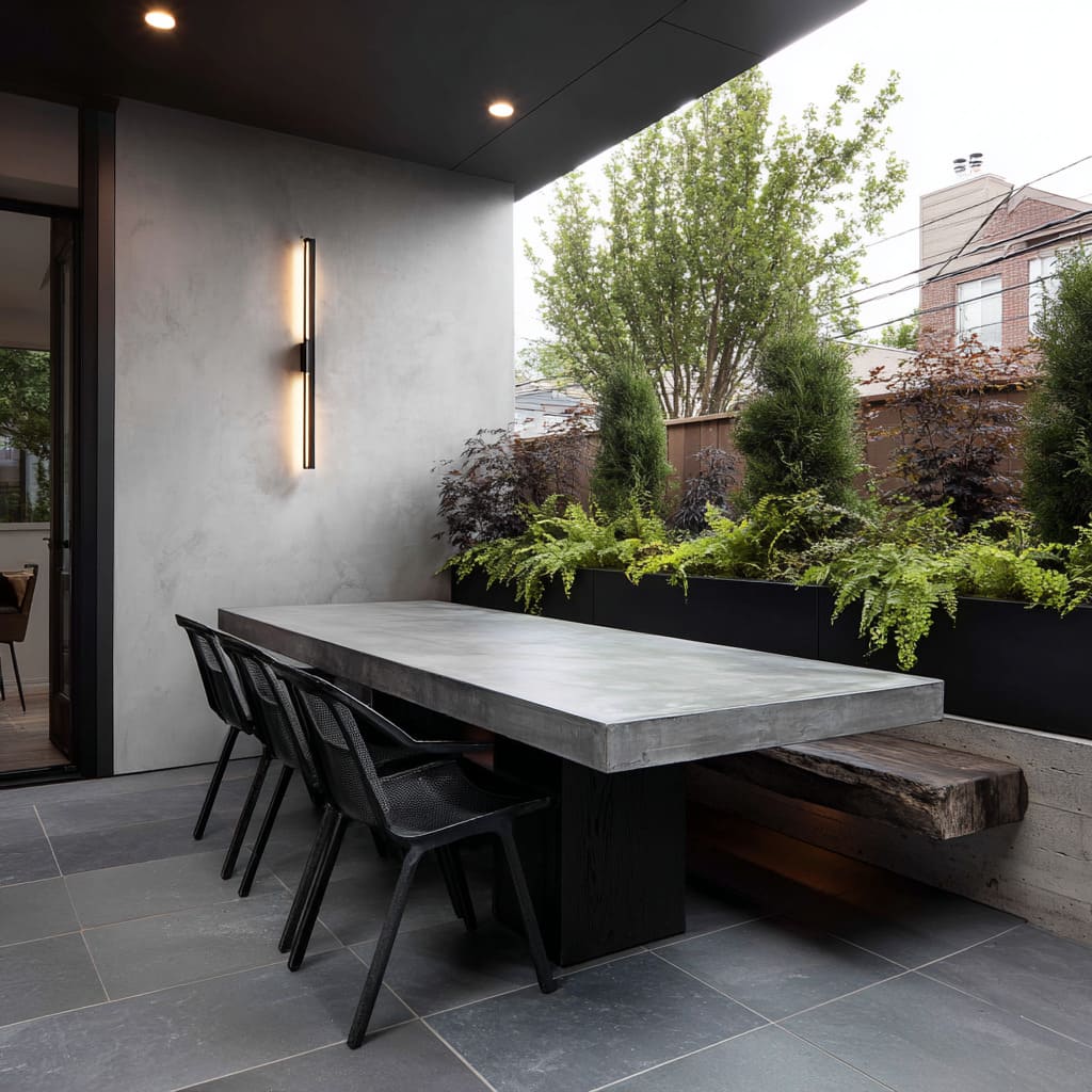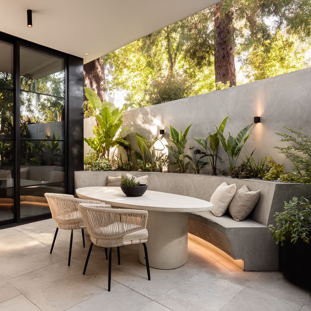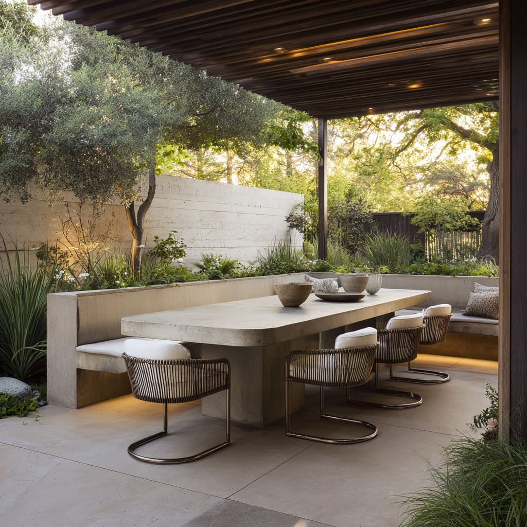 In many modern al fresco dining design layouts, seating isn’t added—it’s built in. Benches formed directly into planter structures dissolve the usual distinction between furniture and garden.