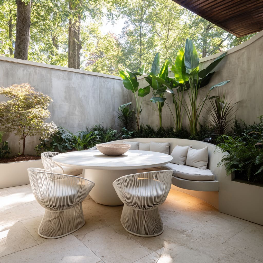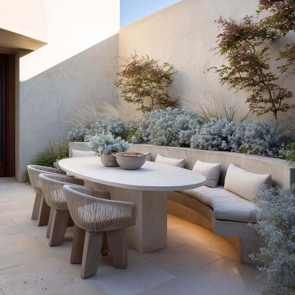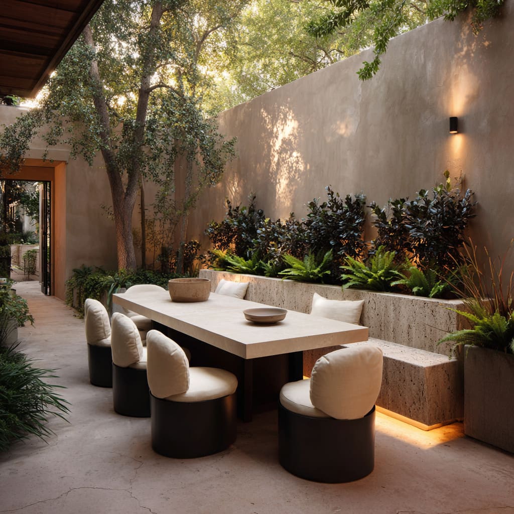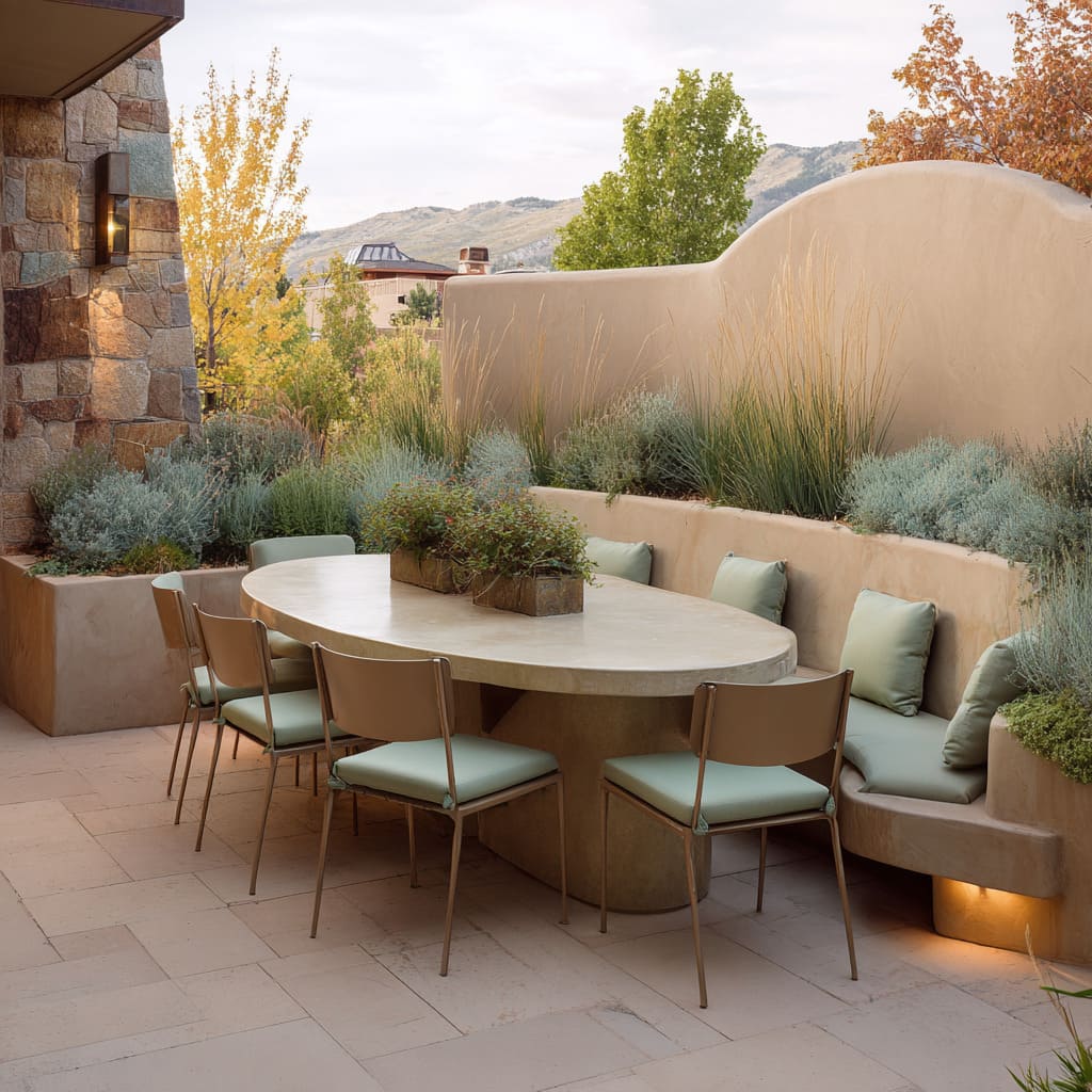 In many modern al fresco dining design layouts, seating isn’t added—it’s built in. Benches formed directly into planter structures dissolve the usual distinction between furniture and garden.