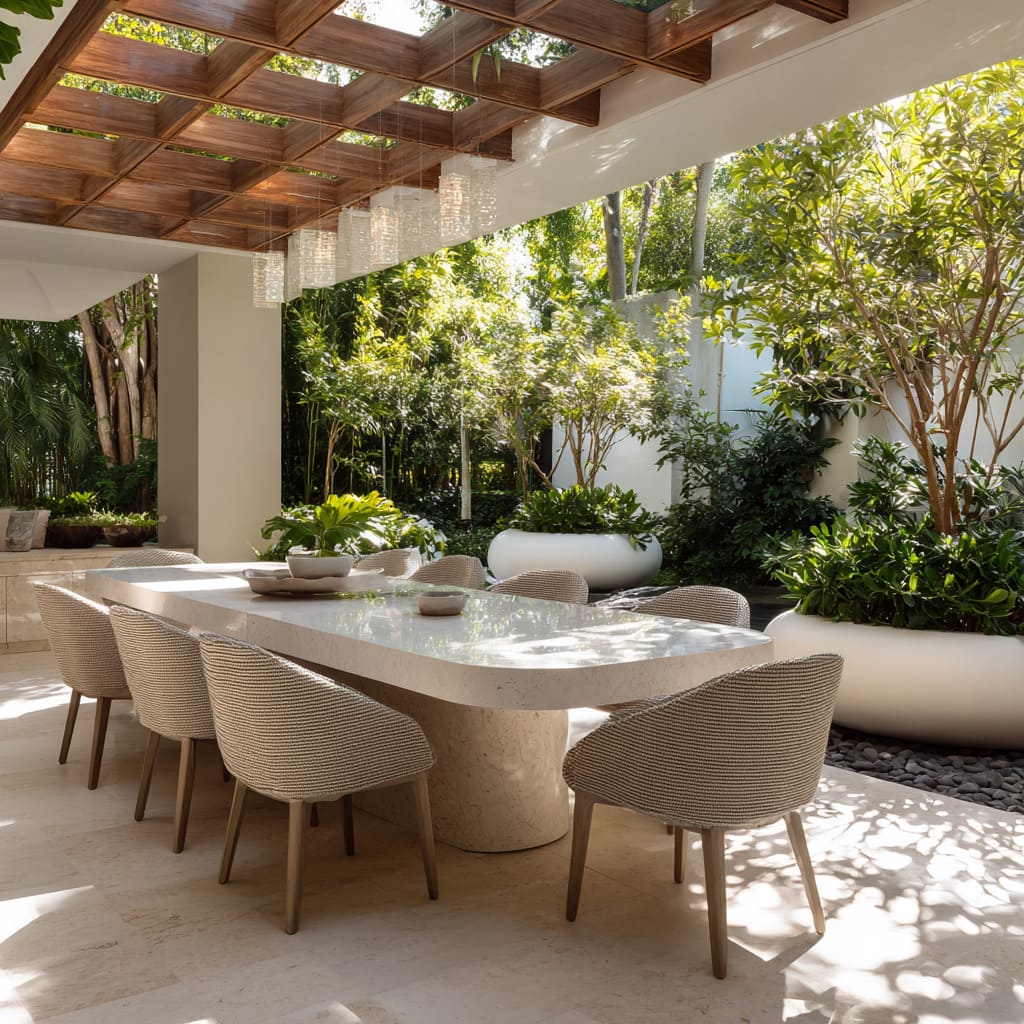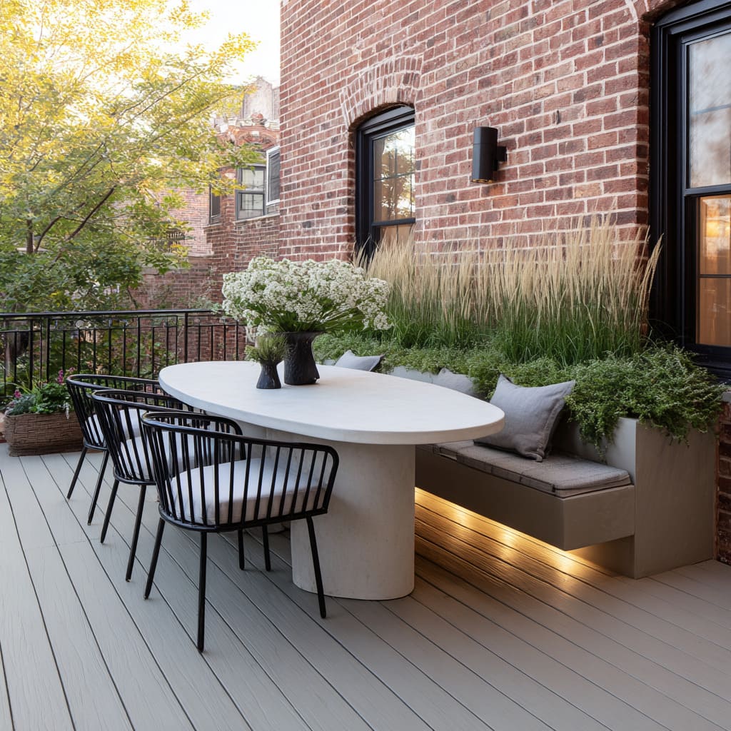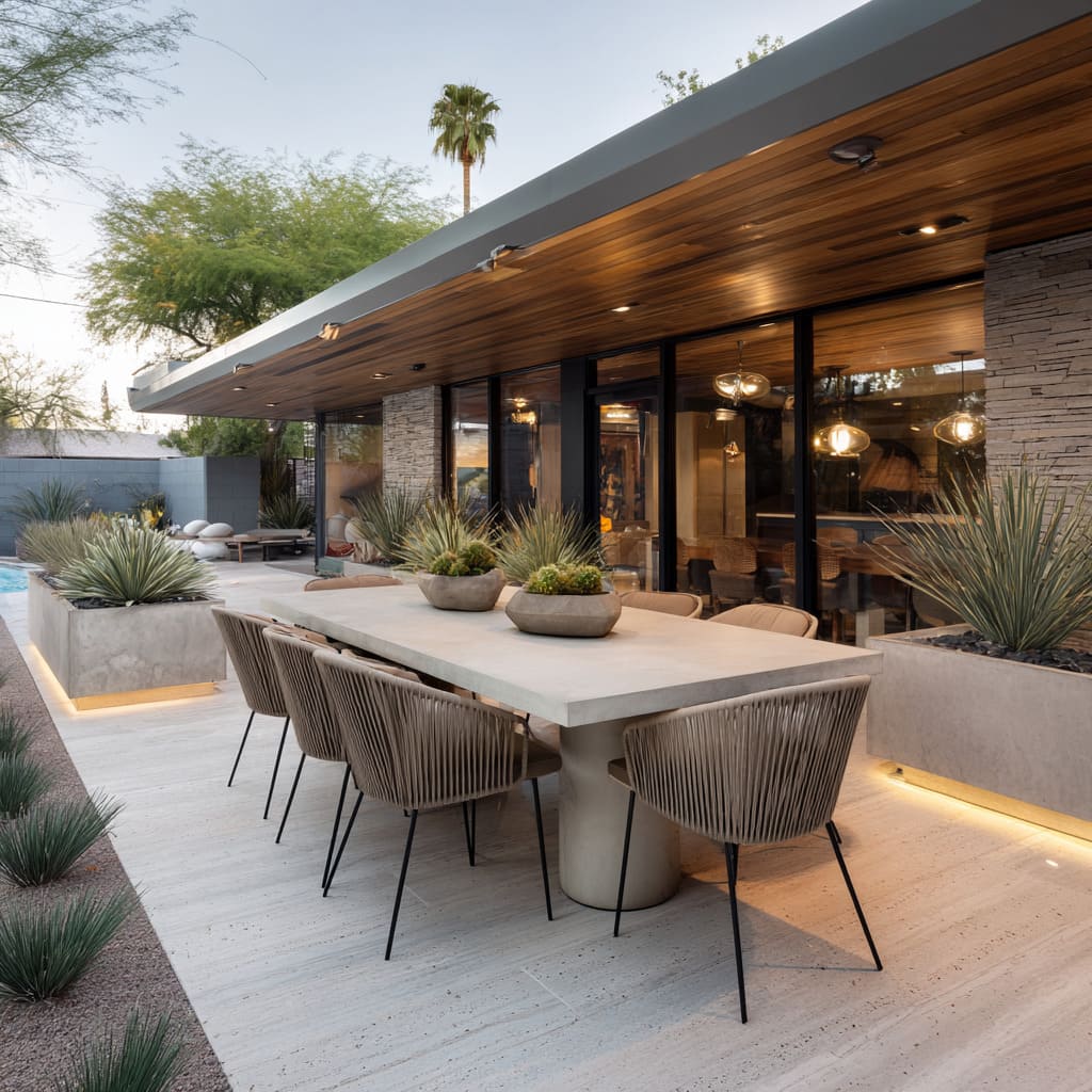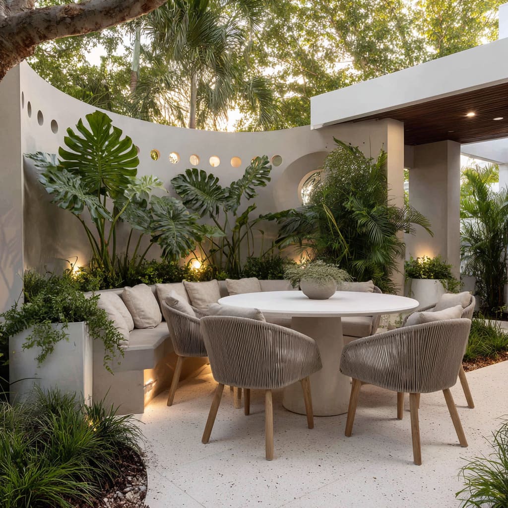 In many modern al fresco dining design layouts, seating isn’t added—it’s built in. Benches formed directly into planter structures dissolve the usual distinction between furniture and garden.