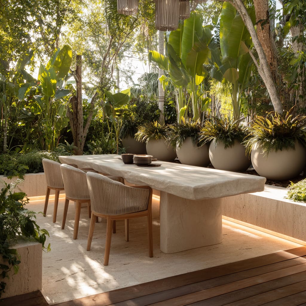 This approach fits especially well with al fresco setups where texture and tone carry the visual identity. In spaces defined by raw stone, layered planting, and filtered light, there’s little need for cluttered decoration.