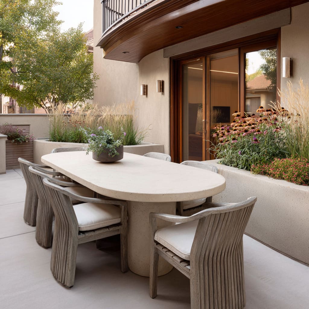 One of the most effective tools in modern layouts is the curve. Rounded tables, soft bench arcs, and even sweeping planter edges play a critical role in reducing visual tension.
