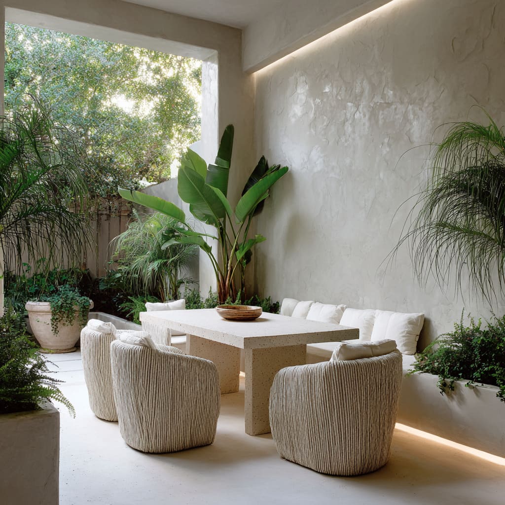 In many al fresco layouts, scale doesn’t come from square footage—it comes from how layers are built across short distances. A dense planter of tall foliage rising behind a bench, a glowing light strip set at the floor line, or a chair placed in front of textured walls—all of these add a subtle sense of distance.