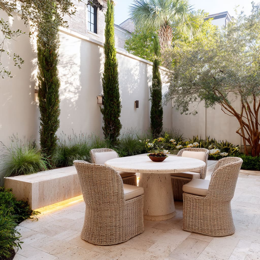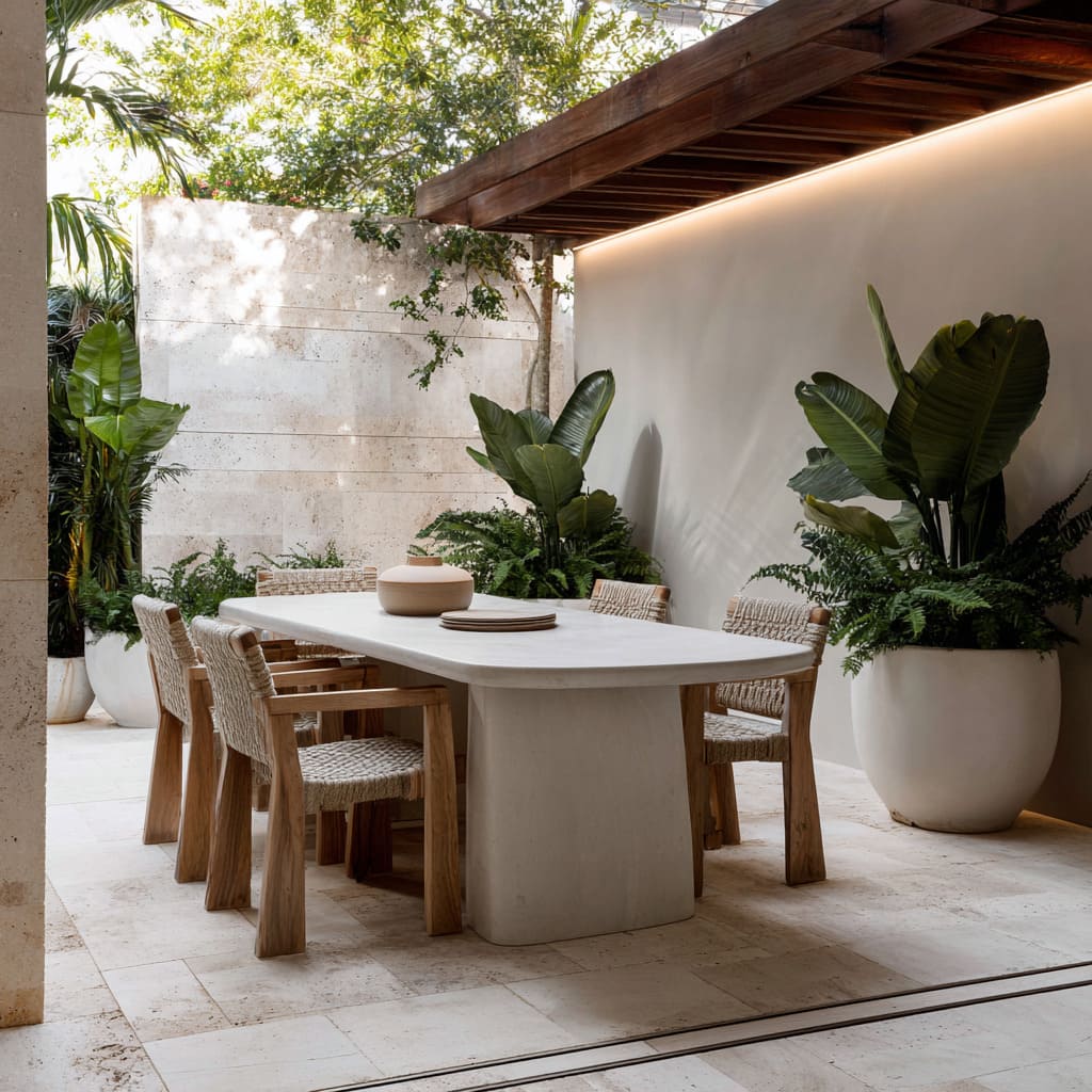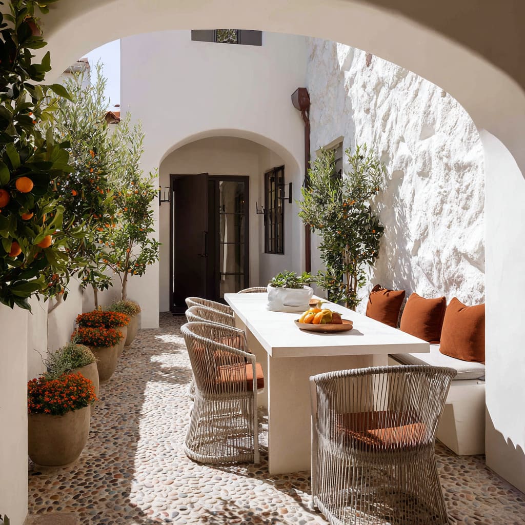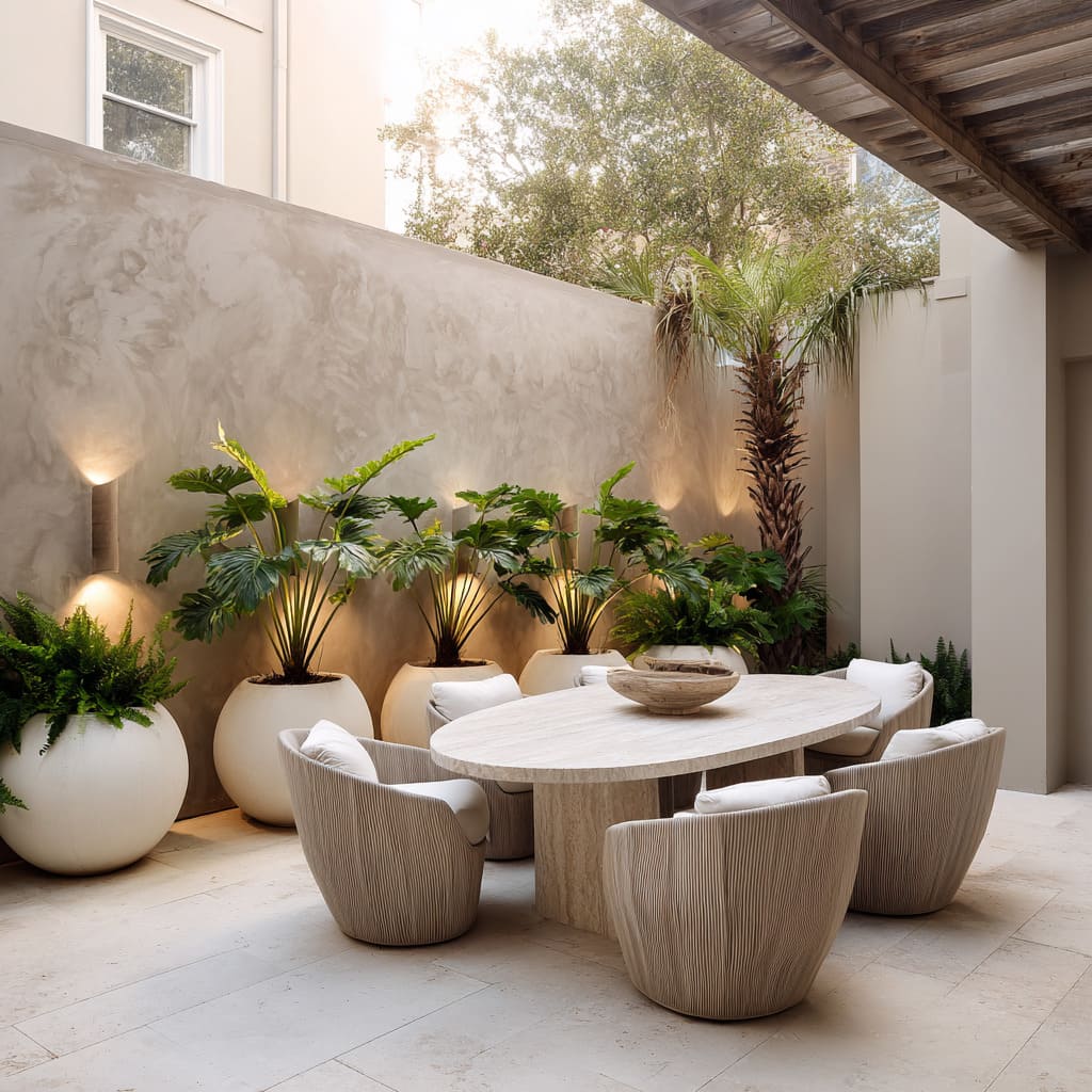 In outdoor spaces built for al fresco dining, color often speaks through tone rather than bold hue. Palettes tend to stay close—sand, chalk, limestone, pale clay, taupe—yet the effect shifts depending on climate.