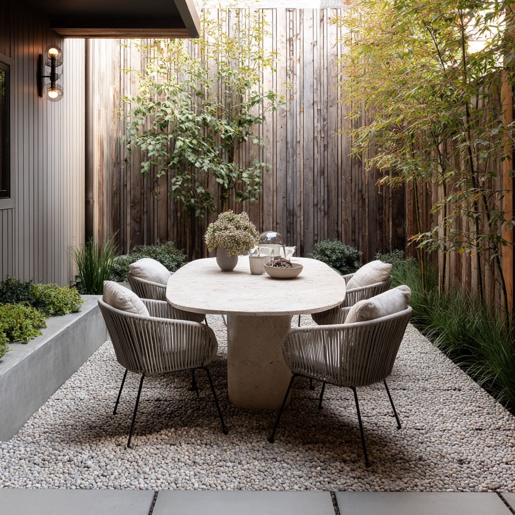 The change is subtle, but powerful—by removing hard angles, the eye is allowed to continue without pause, which creates a gentle spatial rhythm. This trick appears often in circular pedestal tables paired with arc benches or in oval slabs surrounded by soft foliage.