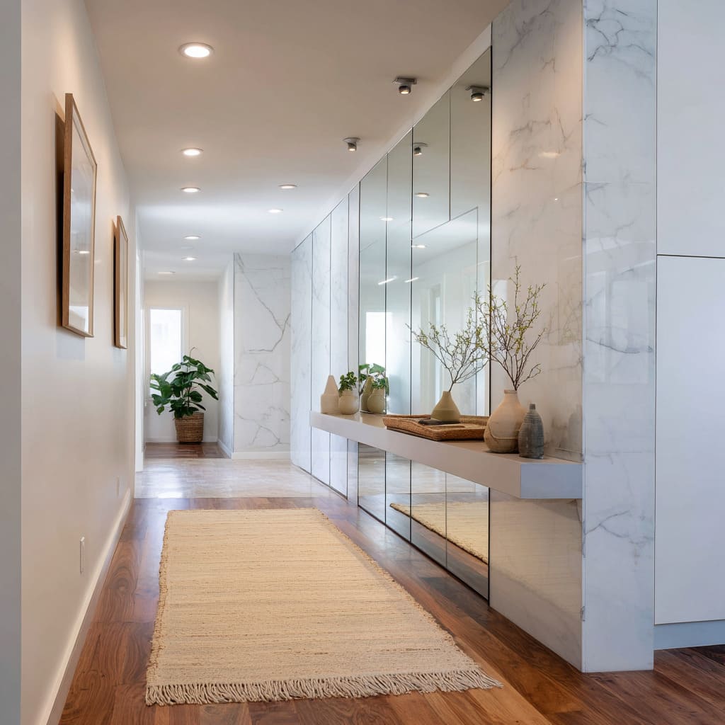 Mirrored surfaces in hallways rarely work like windows—they aren’t there to show the full space, but to quietly echo pieces of it. Whether it’s a narrow vertical mirror repeating a line of ceiling lights or a framed photo bouncing a slatted wood pattern, these reflections introduce rhythm without full exposure.