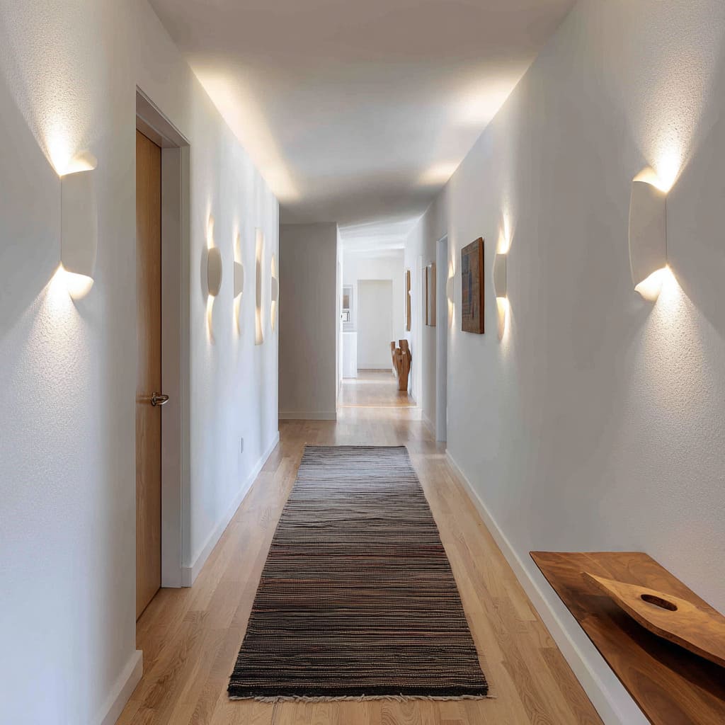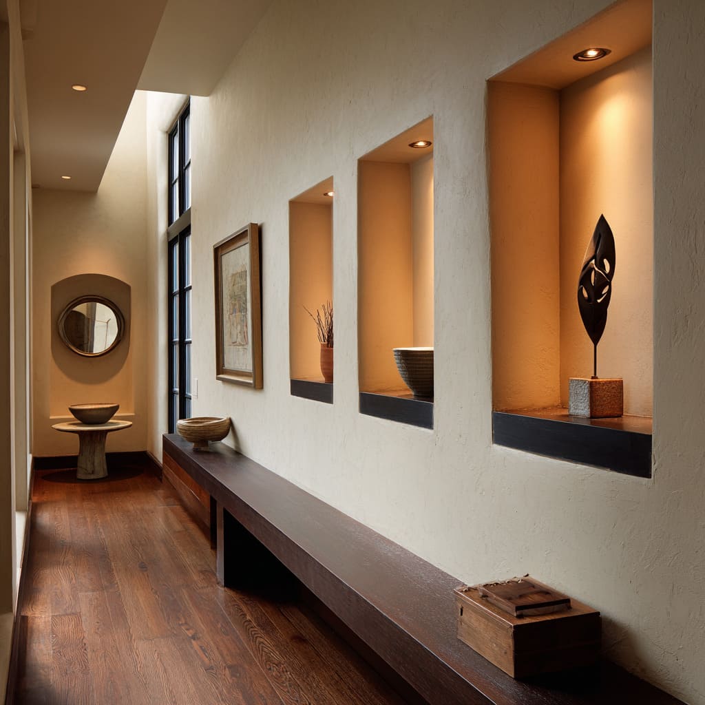 In hallways where floor space is tight, depth doesn’t need to project outward—it can be drawn inward. Recessed wall niches lit from above introduce controlled shadow and depth without interrupting the walkway.