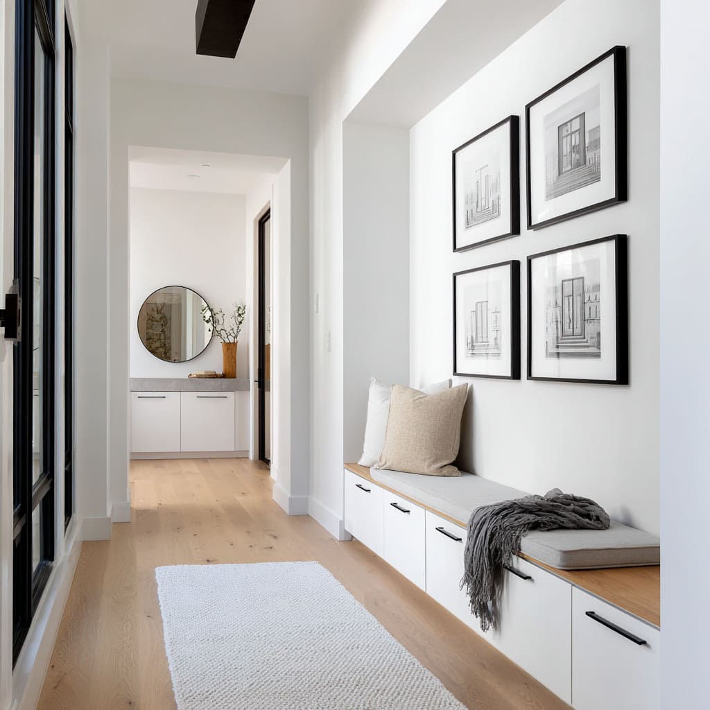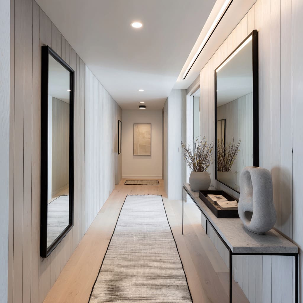 Subtle, layered, and anchored—this kind of quiet contrast defines many of the most effective long hallway ideas seen in high-end interior settings.