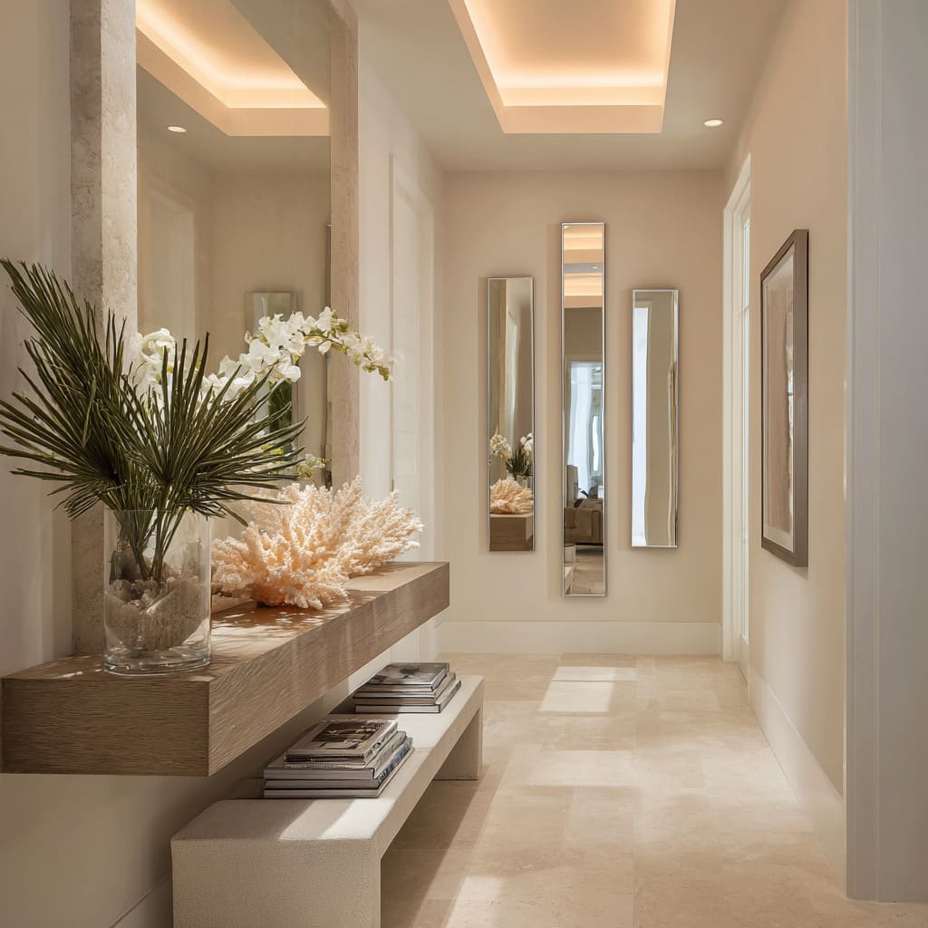 In narrow hallways, the placement of heavier elements like benches or shelves can make or break the balance of space. Floating them—by using cantilevers or hiding their support—visually removes their weight, helping the layout feel breathable.