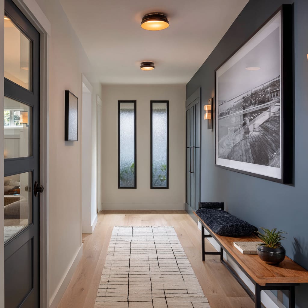 Perfect symmetry has its place, but in long hallway design, too much of it can make a space feel overly rigid. Slight shifts—like placing a mirror off-center from a bench or aligning artwork just outside a doorway’s vertical line—create soft tension that draws the eye.
