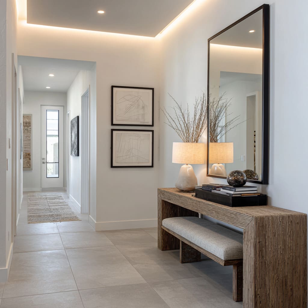 What defines a refined hallway isn’t a long list of additions—it’s how every element is tuned to respond to the next. Light, repetition, texture, and placement are all measured quietly, so the space speaks without pushing.