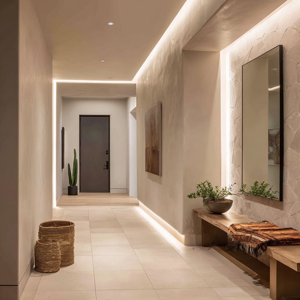 In modern hallway composition, light becomes part of the material palette, not just a tool for visibility. By hiding the light source—whether inside ceiling coves, behind shelf lips, or within wall gaps—the glow emerges without glare.