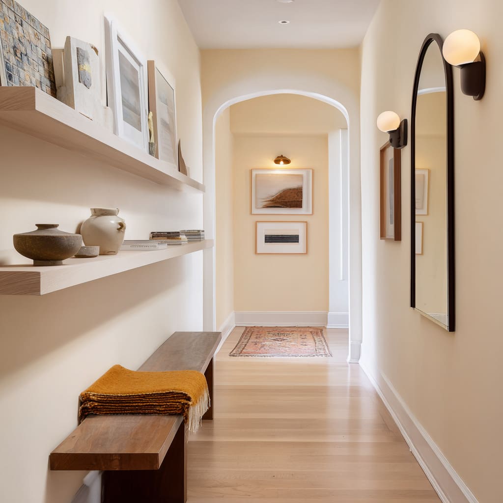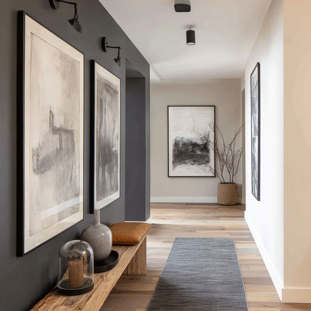 Weight and tactile surface—for example, rough wood grain or matte ceramics—create contrast against smooth walls, encouraging a visual pause. This momentary stop changes how the hallway feels—less like a tunnel and more like a space with chapters.