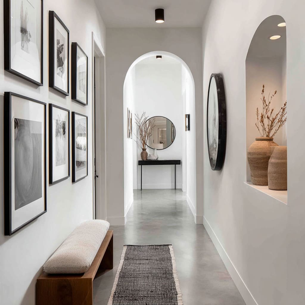 This approach is frequently seen in curated ideas for long narrow hallways, where small moments of irregularity are used to punctuate a steady architectural rhythm.