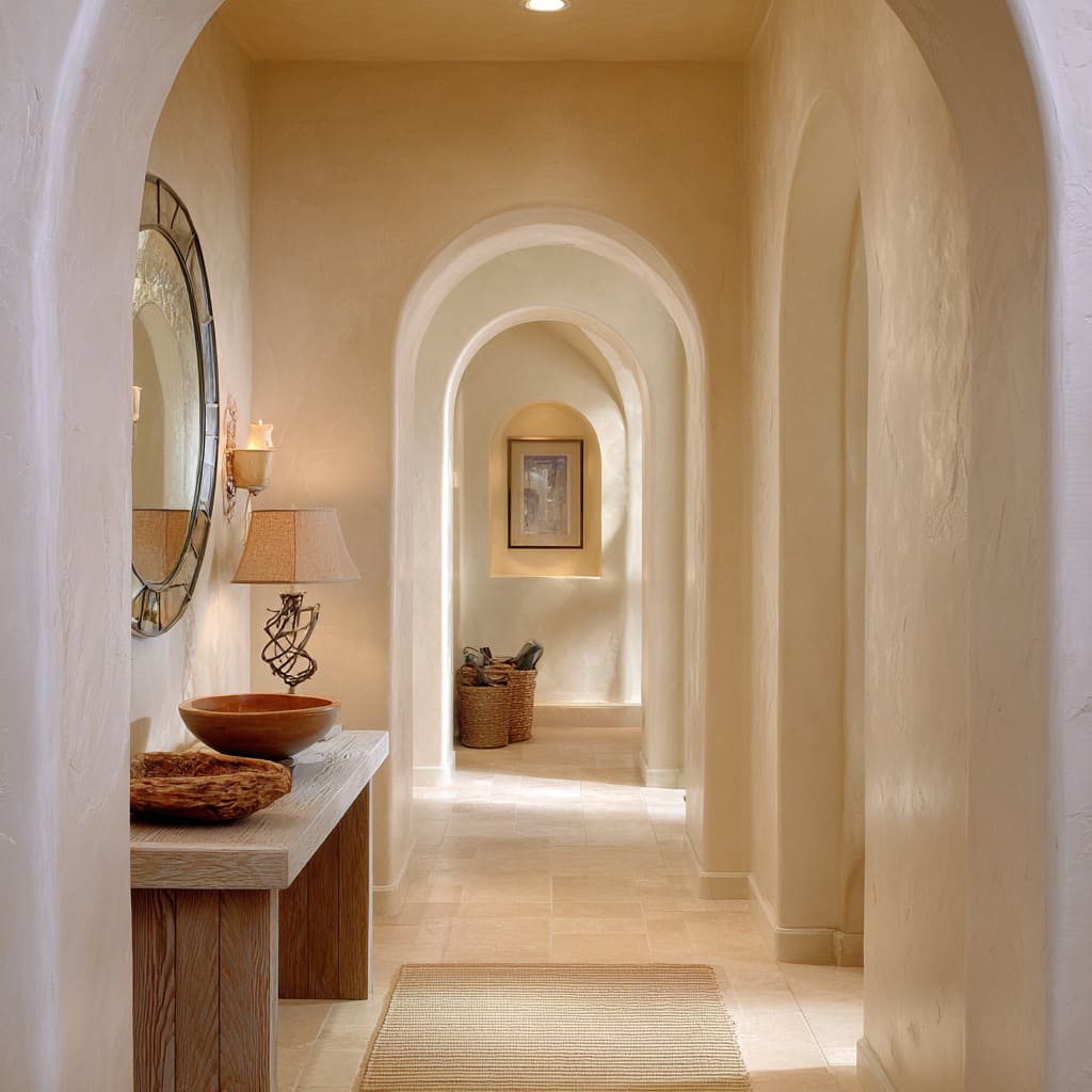 This kind of subtle repetition forms a quiet link, almost like a whispered rhyme within the layout. Especially in efforts to decorate long narrow hallway spaces, rounded elements help ease the flow without changing the structure.