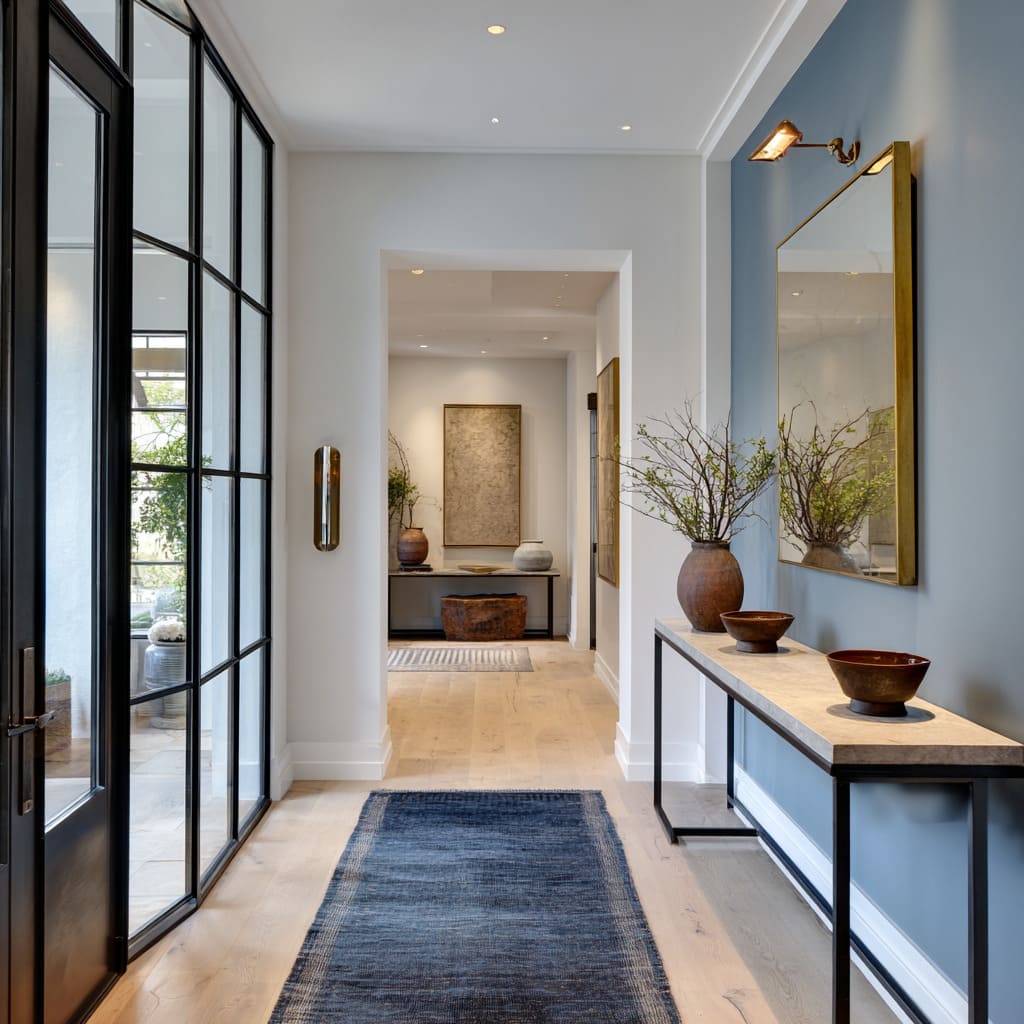 The texture shift alone can carry weight—one cracked bowl beside a mirror can shift the energy of the entire corridor. It’s this push and pull between polish and rawness that keeps long spaces from going cold.