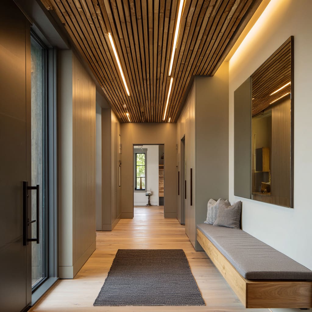 Cladding the ceiling in warm pine, walnut, or slatted oak panels transforms the overhead plane into a feature as essential as the floor. This upper layer stretches the corridor’s direction, creating a sense of motion and depth—especially when it mirrors tones or materials already found in benches, shelves, or trim.