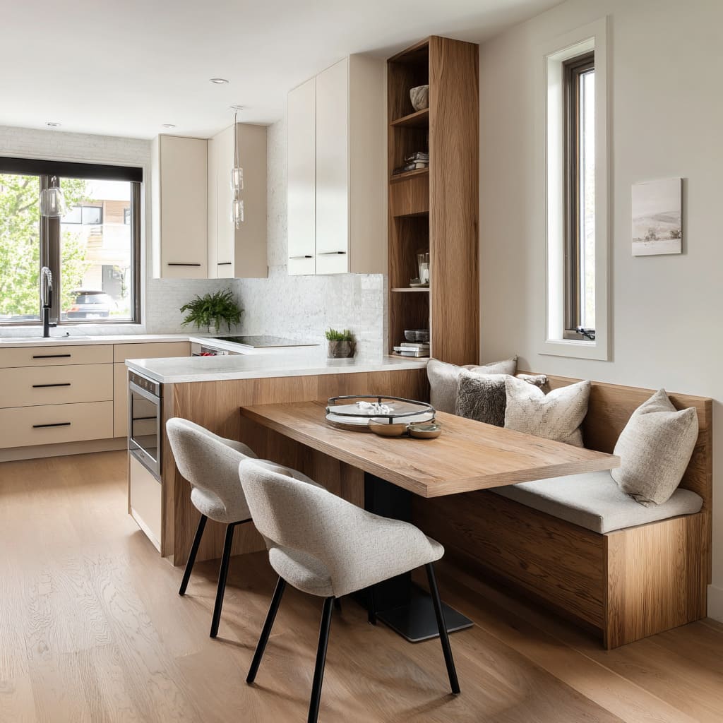 Cube ottomans tucked under a wood band give an intimate, almost lounge-like feeling under a heavy stone island; they can be pulled out for close, informal seating or hidden to let the table read as a clean, uninterrupted strip. In more compact corners, a built-in bench continues the line of the base cabinets, turning the end of a peninsula into something like a café booth, while two light chairs across from it keep the nook from feeling boxed in.