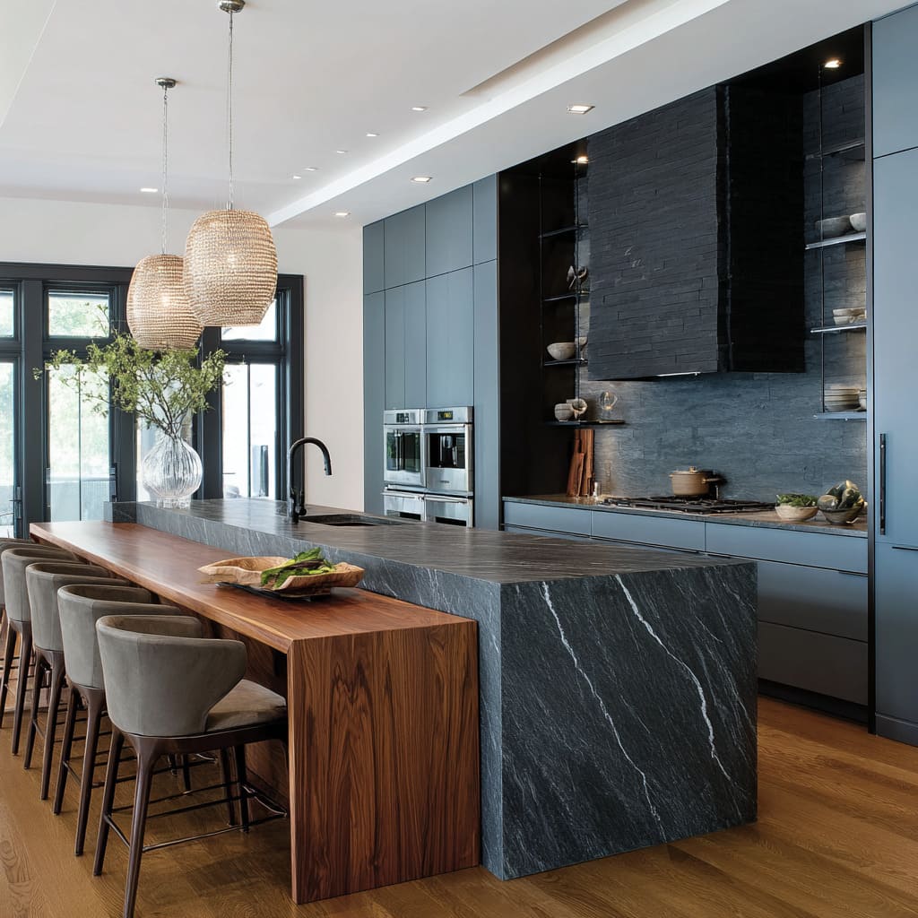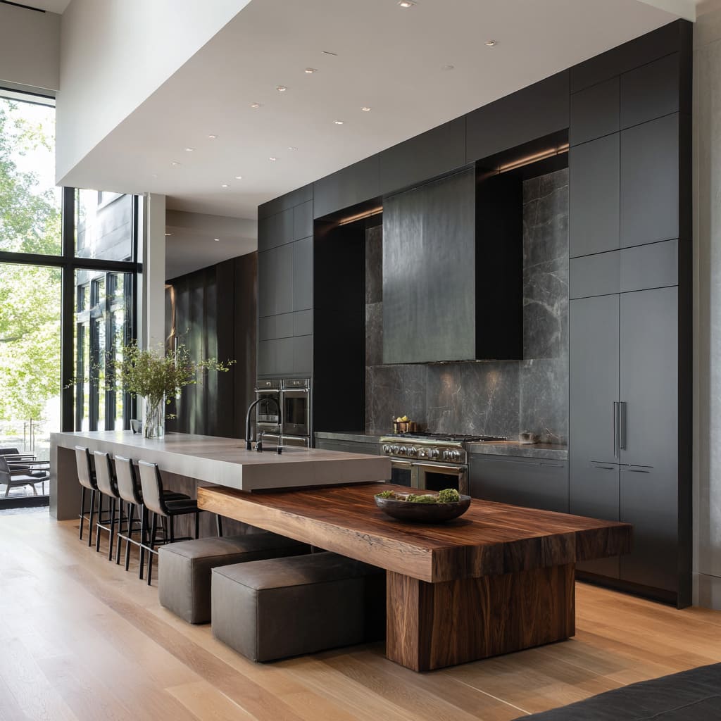 The broader layout around an island and dining table combo is just as carefully composed as the object itself. Tall cabinets often act as a dark, calm backdrop in charcoal, deep blue-grey, or black-stained wood, so that the stone and wood of the island advance visually into the foreground.