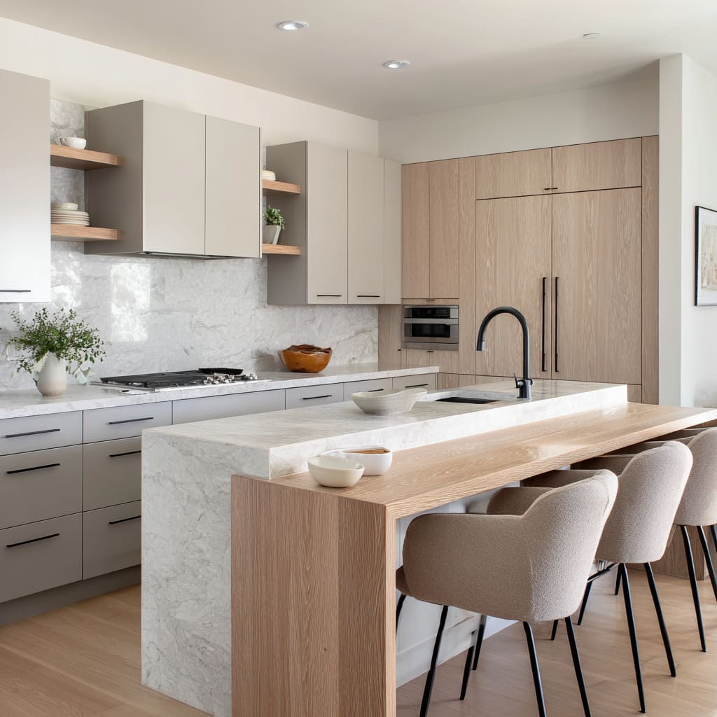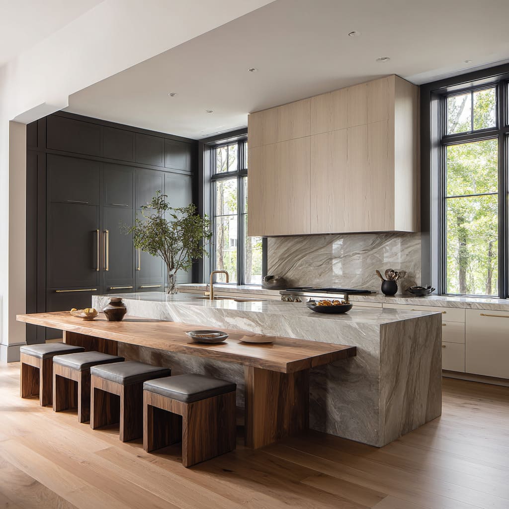 Taken together, these ideas show how a single island–table piece can quietly organize the whole kitchen design, turning it into a shared space rather than a split zone of “work here, eat there. ” Stone, wood, seating, and light are used with enough precision that the change from prep to dining is understood through material, height, and background instead of big gestures.