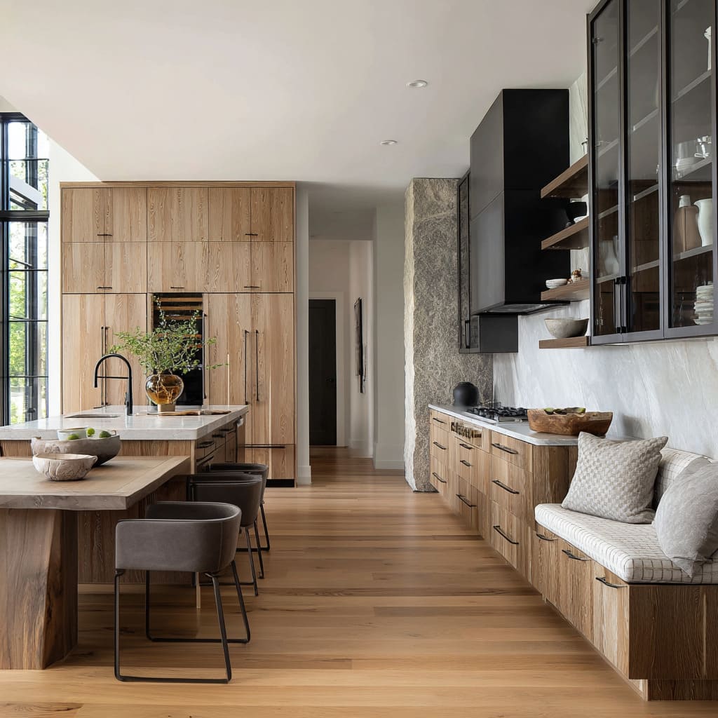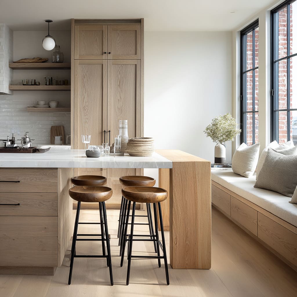 Built-in benches beneath windows connect seating to structure. A long bench in the same oak as the island base can run under black-framed windows, with oversized cushions leaning against the frames.