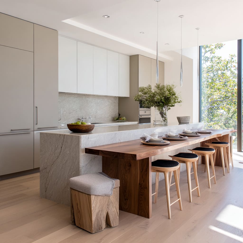 Behind the calm look, kitchen island dining table hybrid ideas almost always hinge on a precise conversation between cool stone and warm wood. Stone is given the more disciplined role: it forms waterfall blocks, continuous counters, or monolithic volumes in pale beige, soft grey, charcoal, or nearly white finishes.