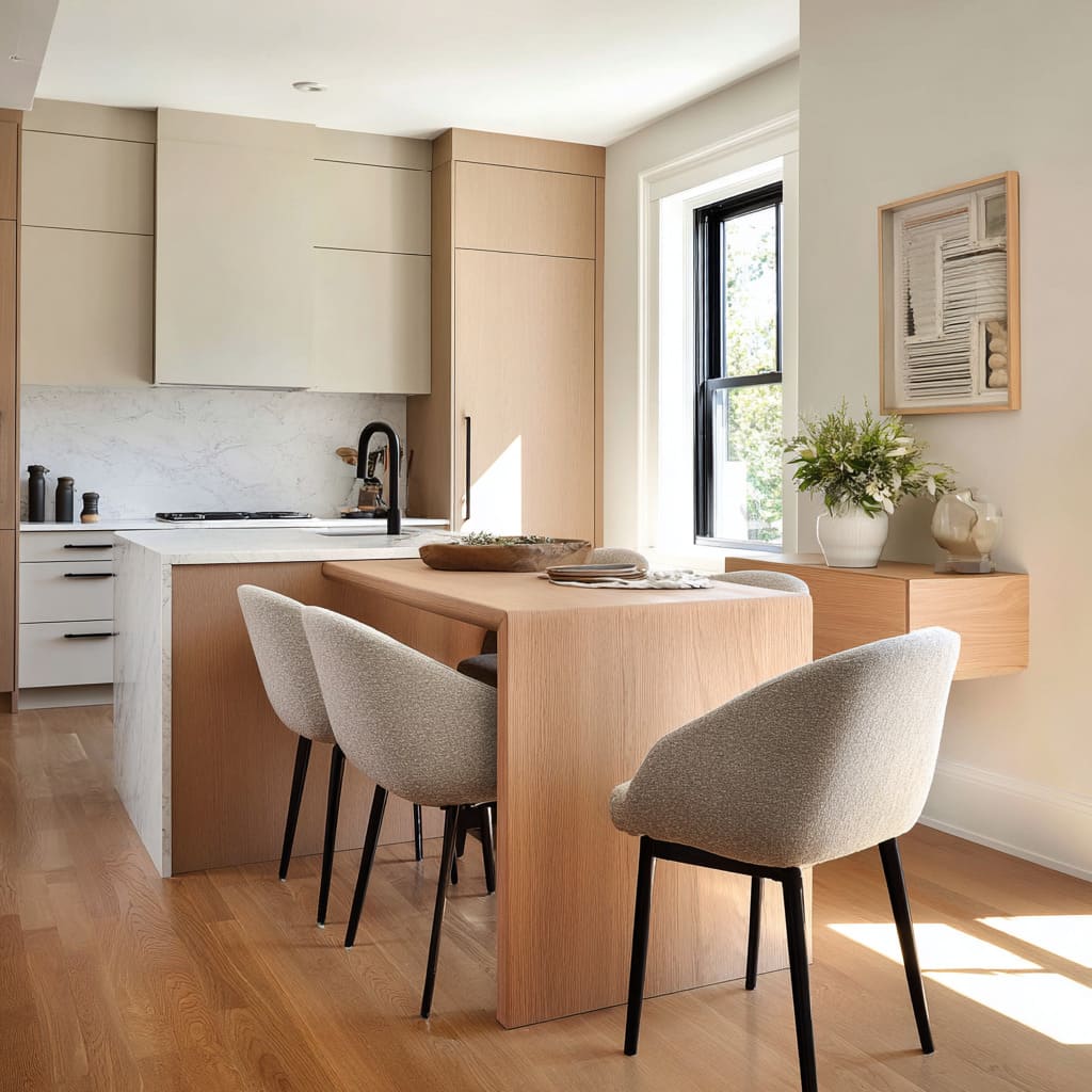 Even here, the rest of the room stays calm: neutral drawers, aligned pulls, softly glowing cabinets, and a consistent floor tone ensure that strong wood does not overpower the interior. Whether quiet or expressive, the island–dining combination acts as the emotional heart of the kitchen, concentrating texture, touch, and social life into one elongated piece that keeps the entire space visually and atmospherically coherent.