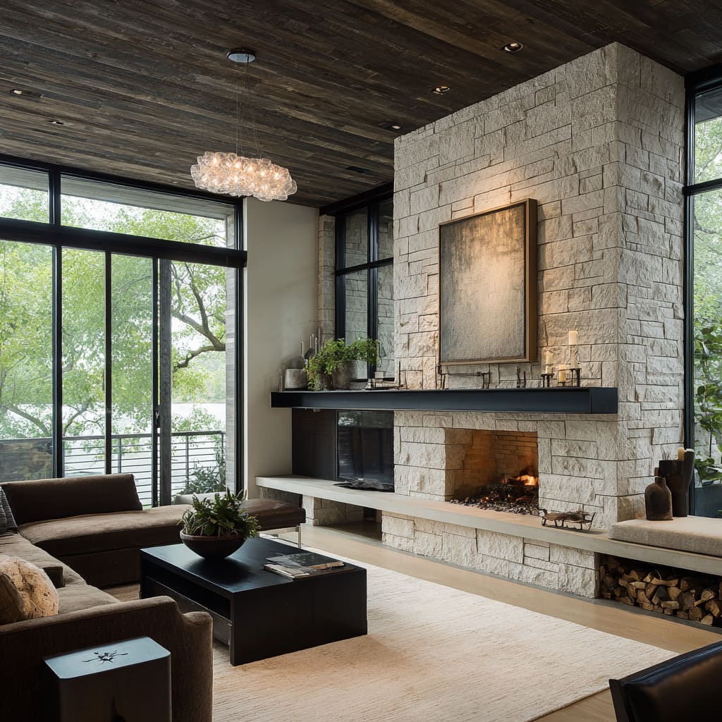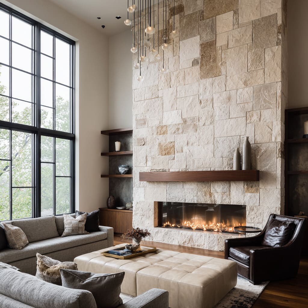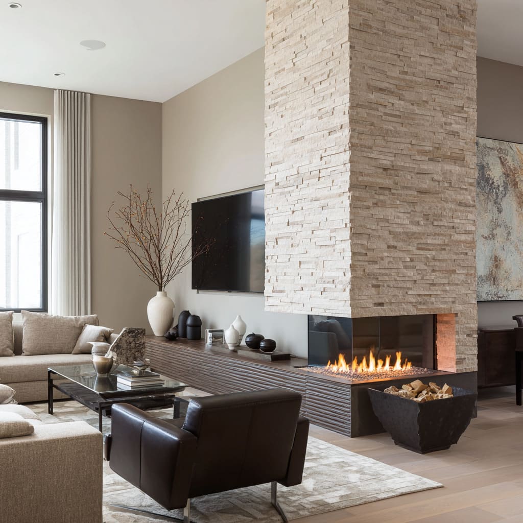 This approach is especially effective in open layouts because it allows the fireplace to belong to the center of the home, not only to one wall. The stone reads less like “feature wall” and more like “architectural furniture.
