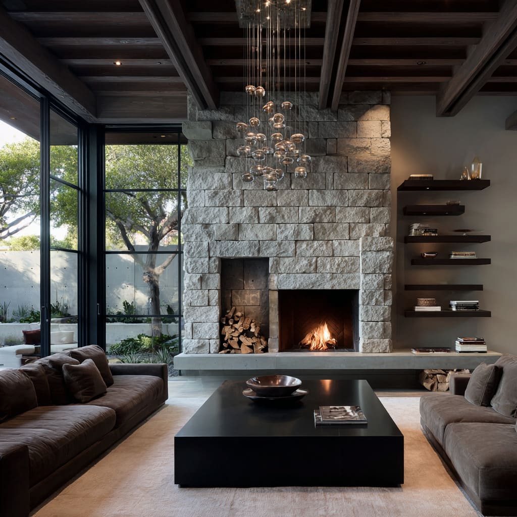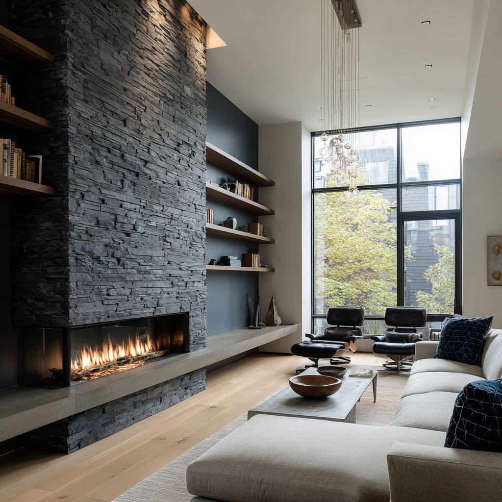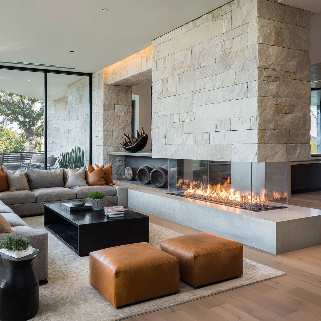 This approach is especially effective in open layouts because it allows the fireplace to belong to the center of the home, not only to one wall. The stone reads less like “feature wall” and more like “architectural furniture.