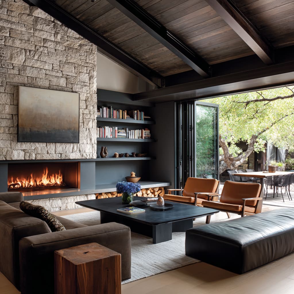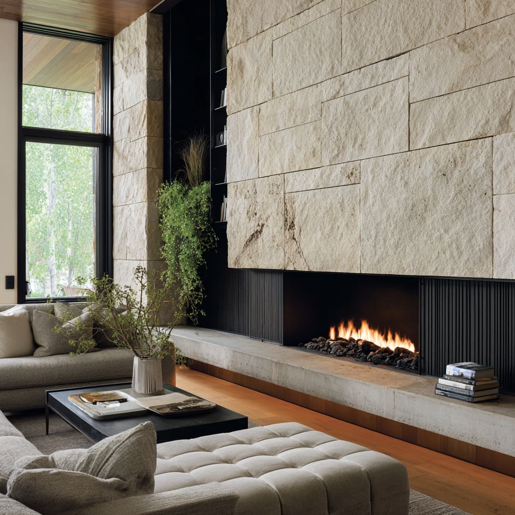 • Serene: pale stone, long horizontal fire line, minimal decor, soft matte textiles, lots of daylight.