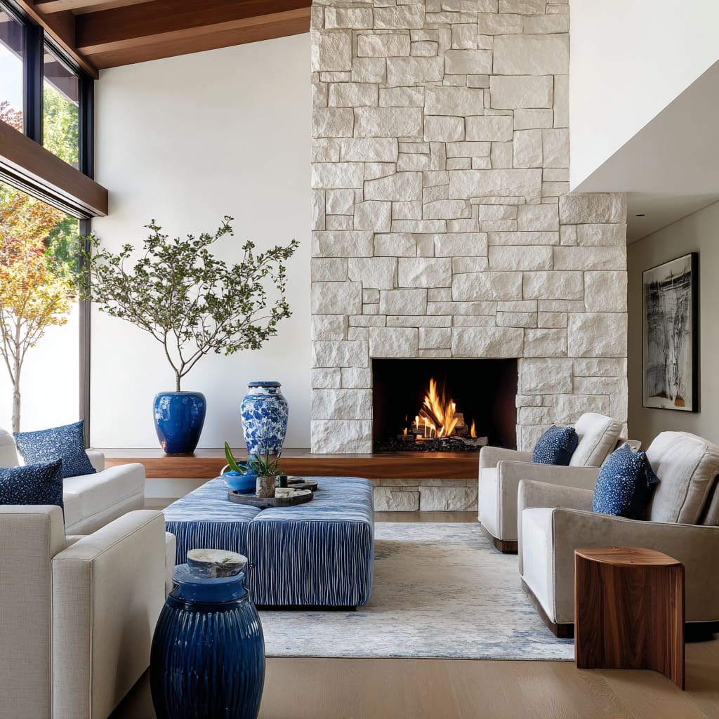 Off-white cut-stone fireplace tower concept with a warm wood bench line and blue as the calm accent